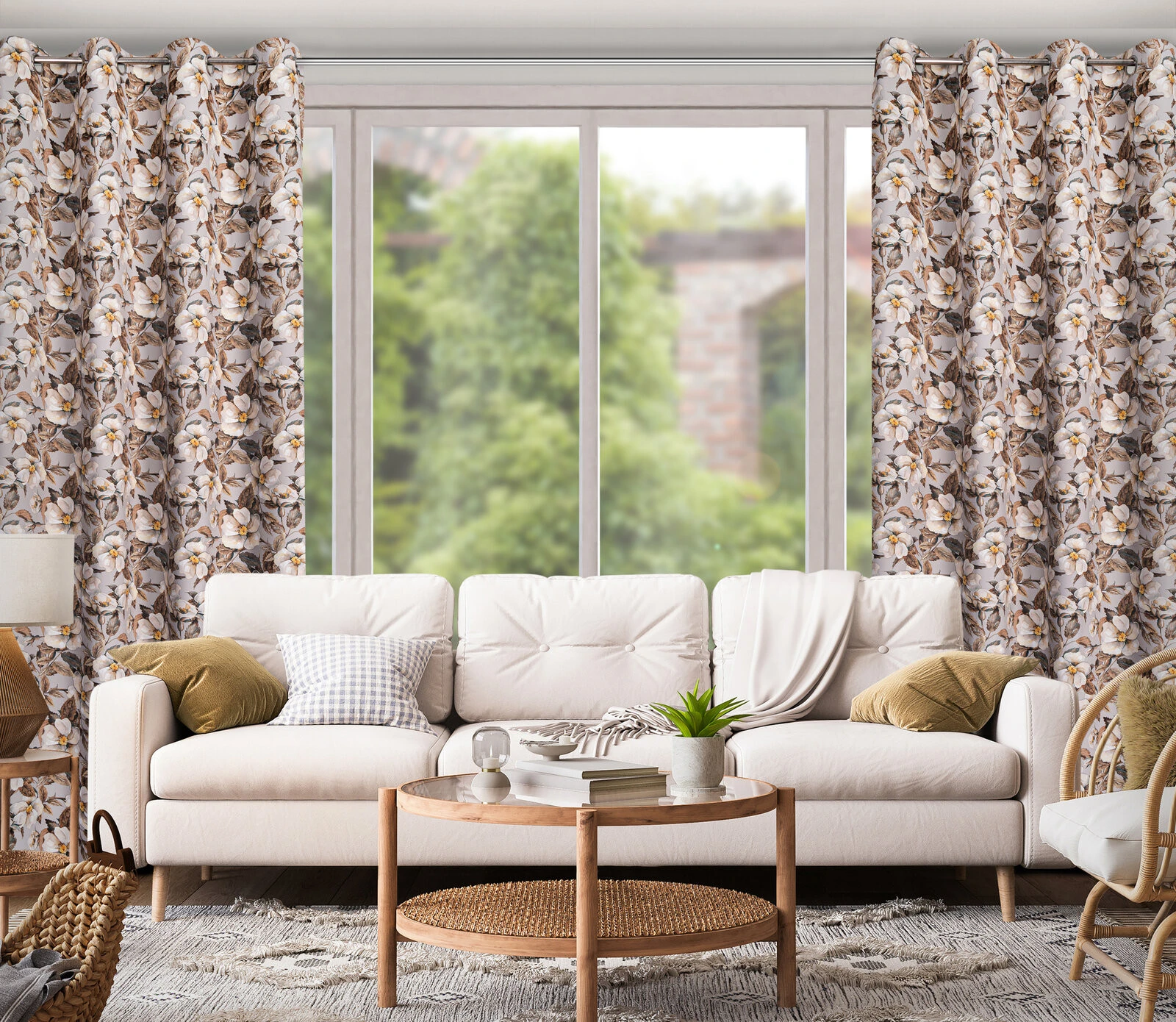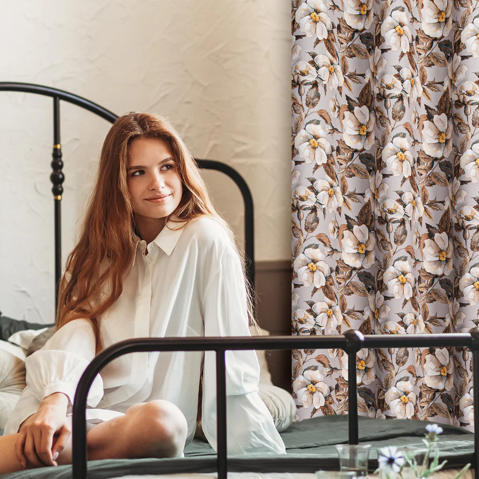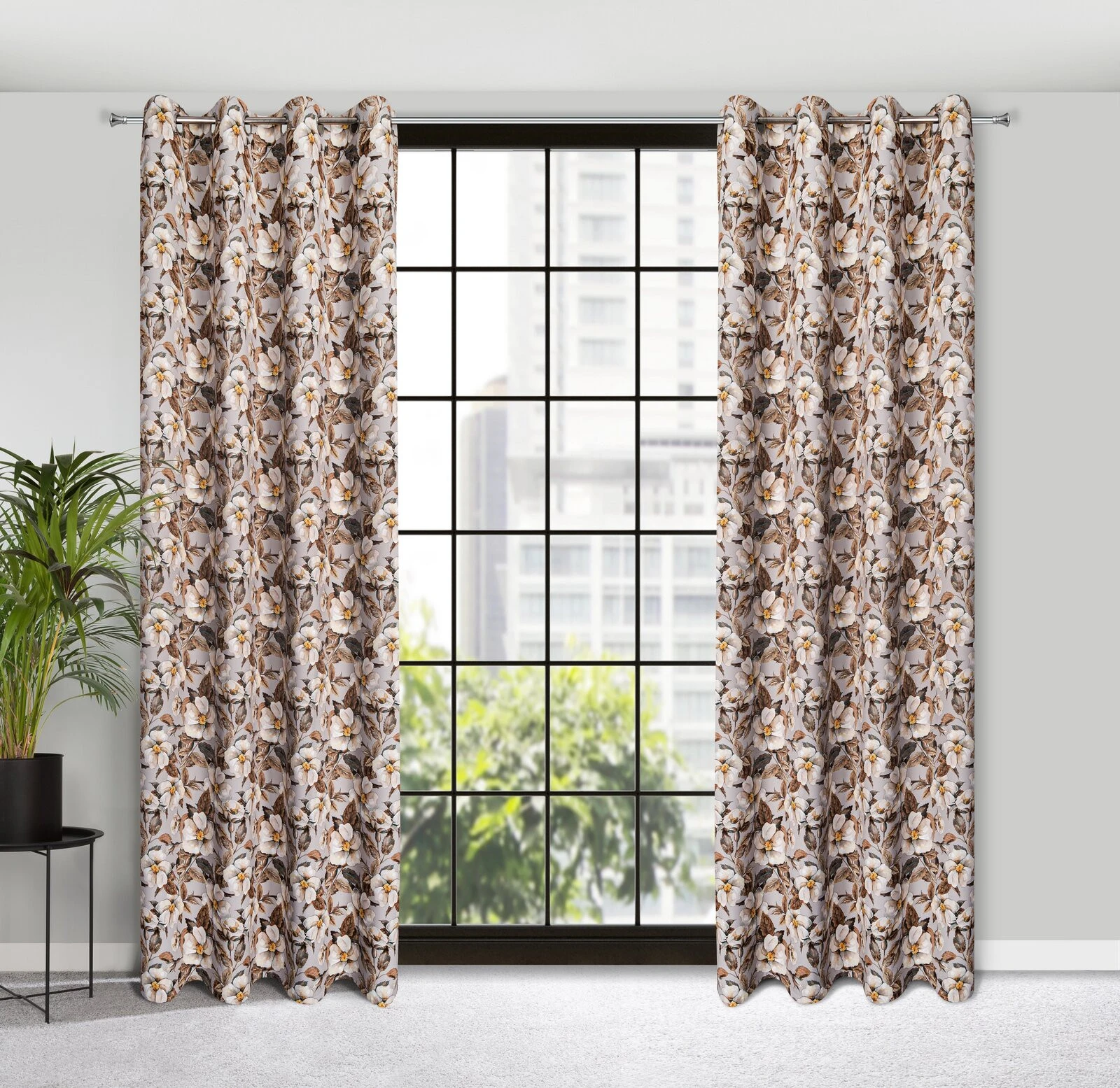 - Zasłona zaciemniająca z kwiatowym nadrukiem szerokość: 140 cm, długość: 250 cm, kolor: beżowy, Gramatura: 210 GSM, Skład: 100% poliester