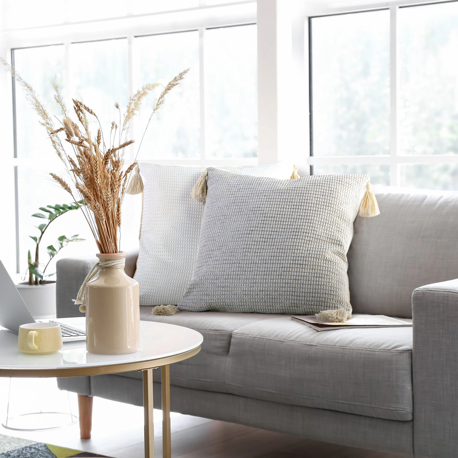 - Poszewka dekoracyjna w stylu boho zdobiona pomponami szerokość: 45 cm, długość: 45 cm, kolor: beżowy, Skład: 100% poliester