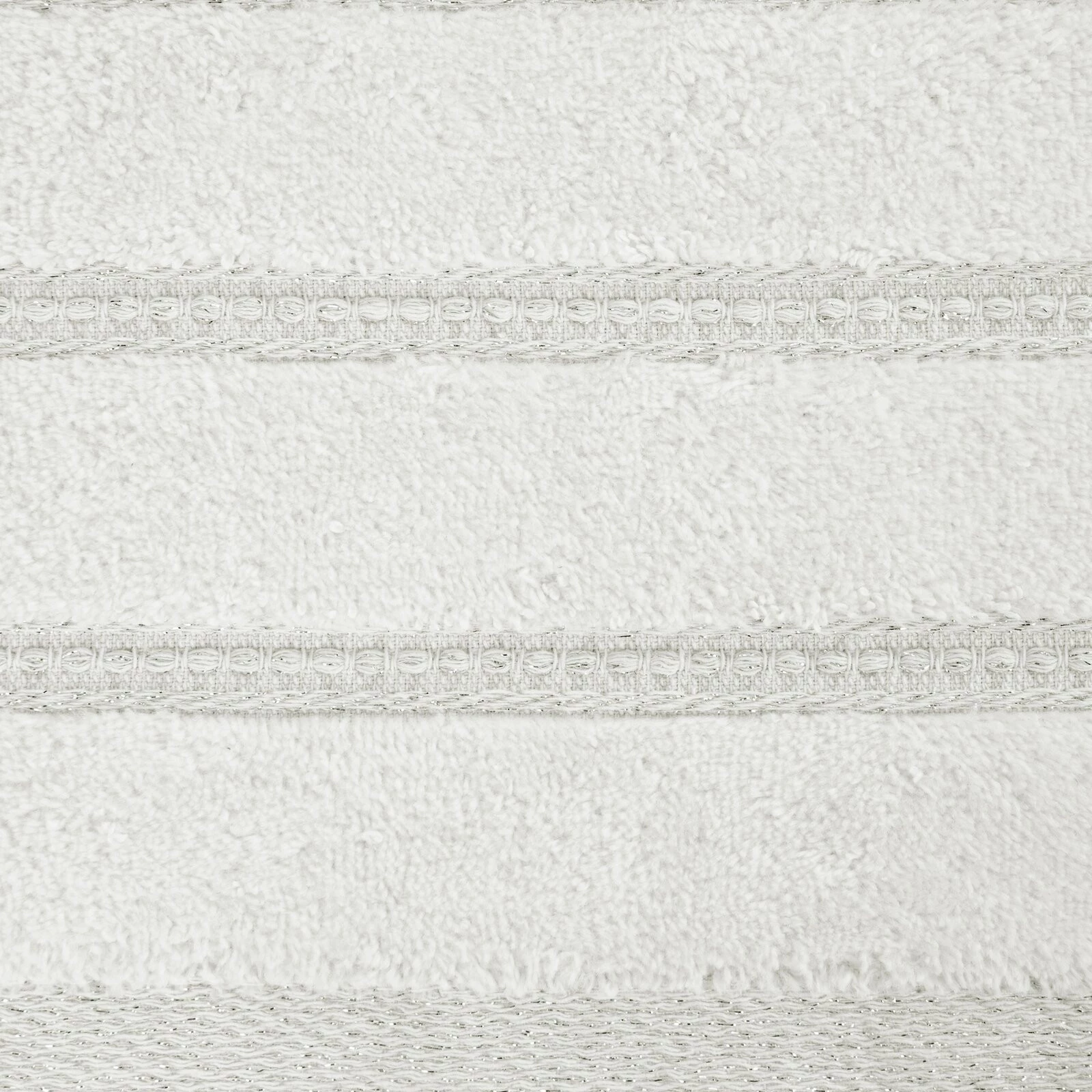 Klasyczny ręcznik kąpielowy z chłonnej tkaniny bawełnianej o splocie frotte. Minimalistyczna bordiura z weluru z dodatkiem lśniącej, metalicznej nici. szerokość: 30 cm, długość: 50 cm, kolor: kremowy, Gramatura: 500 GSM, Skład: 100% bawełna, 99.2% bawełna, 0.8% nić metaliczna