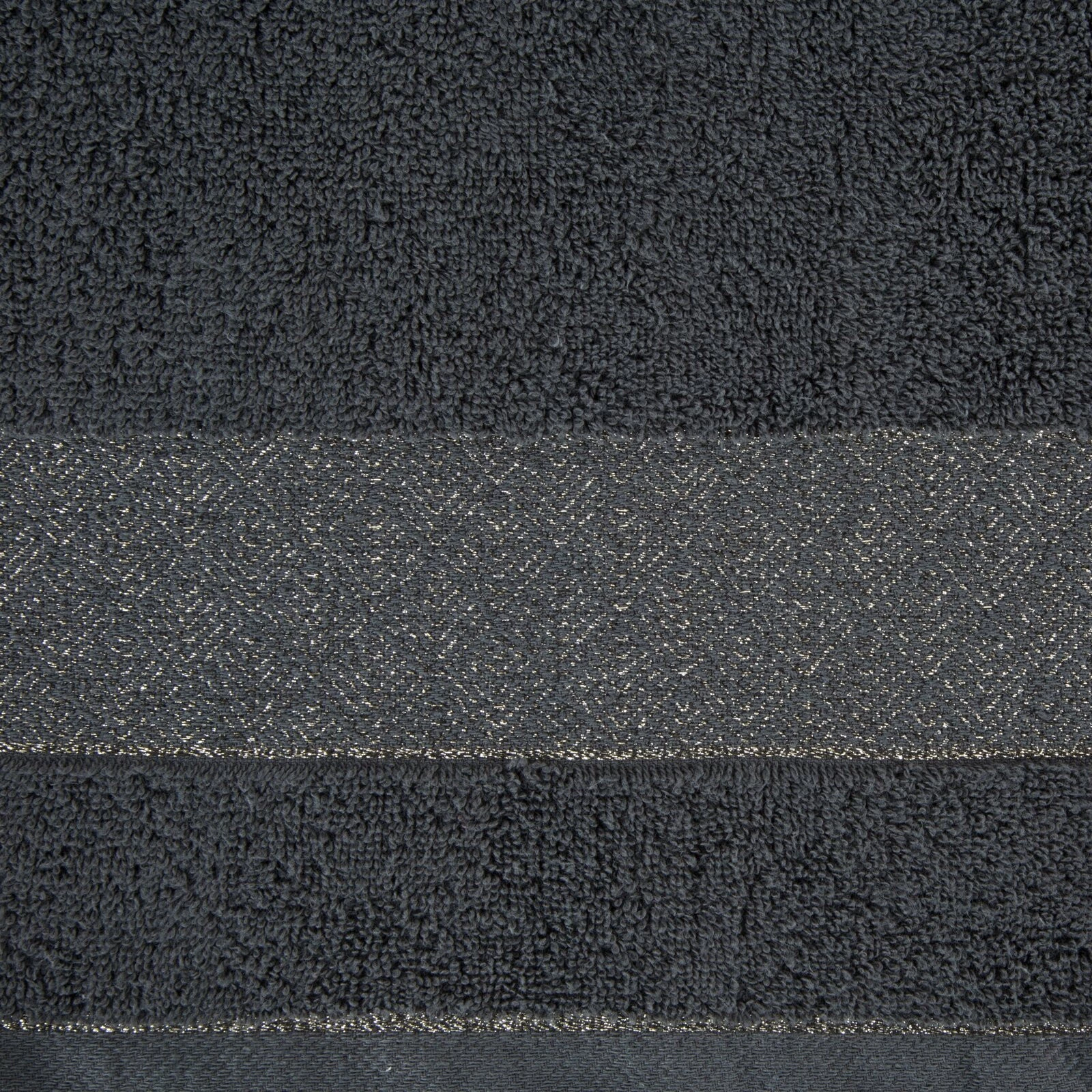 Jednobarwny ręcznik z miękkiej i chłonnej tkaniny bawełnianej o splocie frotte zdobiony kolorową bordiurą w stylu fastrygi. Łatwy w praniu, nie farbuje. szerokość: 50 cm, długość: 90 cm, kolor: stalowy, Gramatura: 500 GSM, Skład: 100% bawełna; część ozdobna: 50% bawełna, 50% poliester