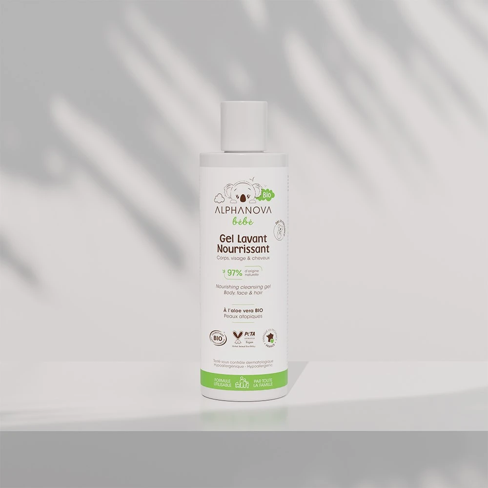 Poznaj odżywczy żel myjący do twarzy, ciała i włosów ALPHANOVA bébé® BIO, który delikatnie oczyszcza i łagodzi suchą i atopową skórę niemowląt, od pierwszych dni życia. Dzięki formule w 97% opartej na naturalnych składnikach, wzbogaconej organicznym aloesem i nawilżającą gliceryną, chroni skórę przed wysuszeniem i działaniem czynników zewnętrznych. Jego kremowa piana łatwo się spłukuje, a skóra dziecka staje się czysta i ukojona. Fizjologiczne pH sprawia, że żel jest odpowiedni nawet dla najbardziej wrażliwej skóry.