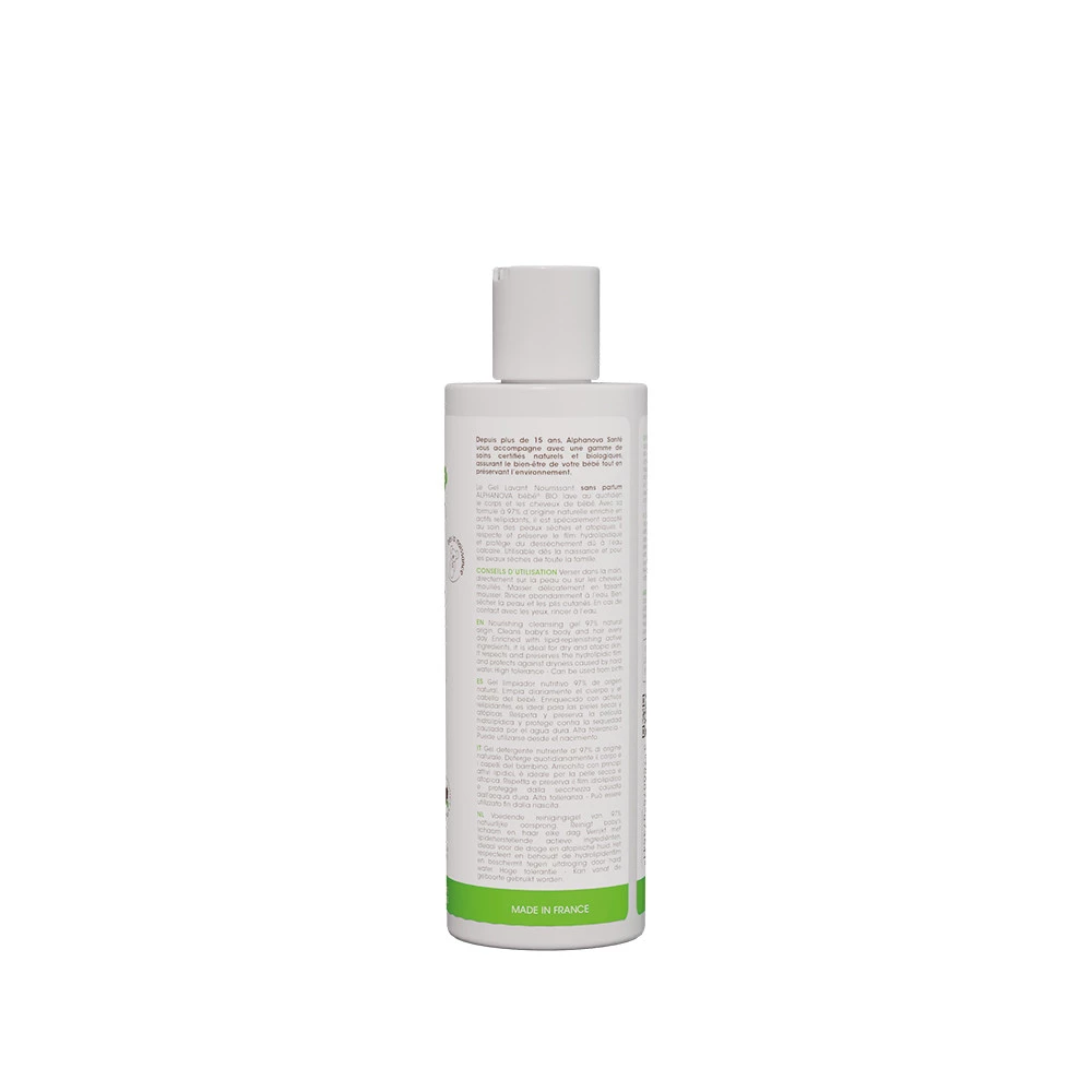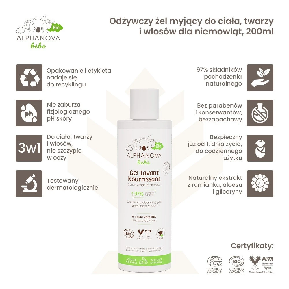 Alphanova Bebe Bio, Odżywczy żel myjący do ciała, twarzy i włosów dla niemowląt, 200ml