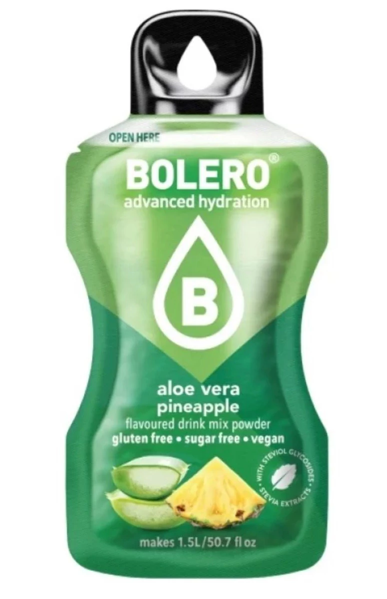Bolero Instant Drink Sticks Aloe Vera Pineapple to innowacyjny produkt przeznaczony do przyrządzania napojów o smaku aloesu i ananasa. Opakowanie zawiera 3g proszku – jest to porcja, z której można przygotować do 1,5 l napoju.