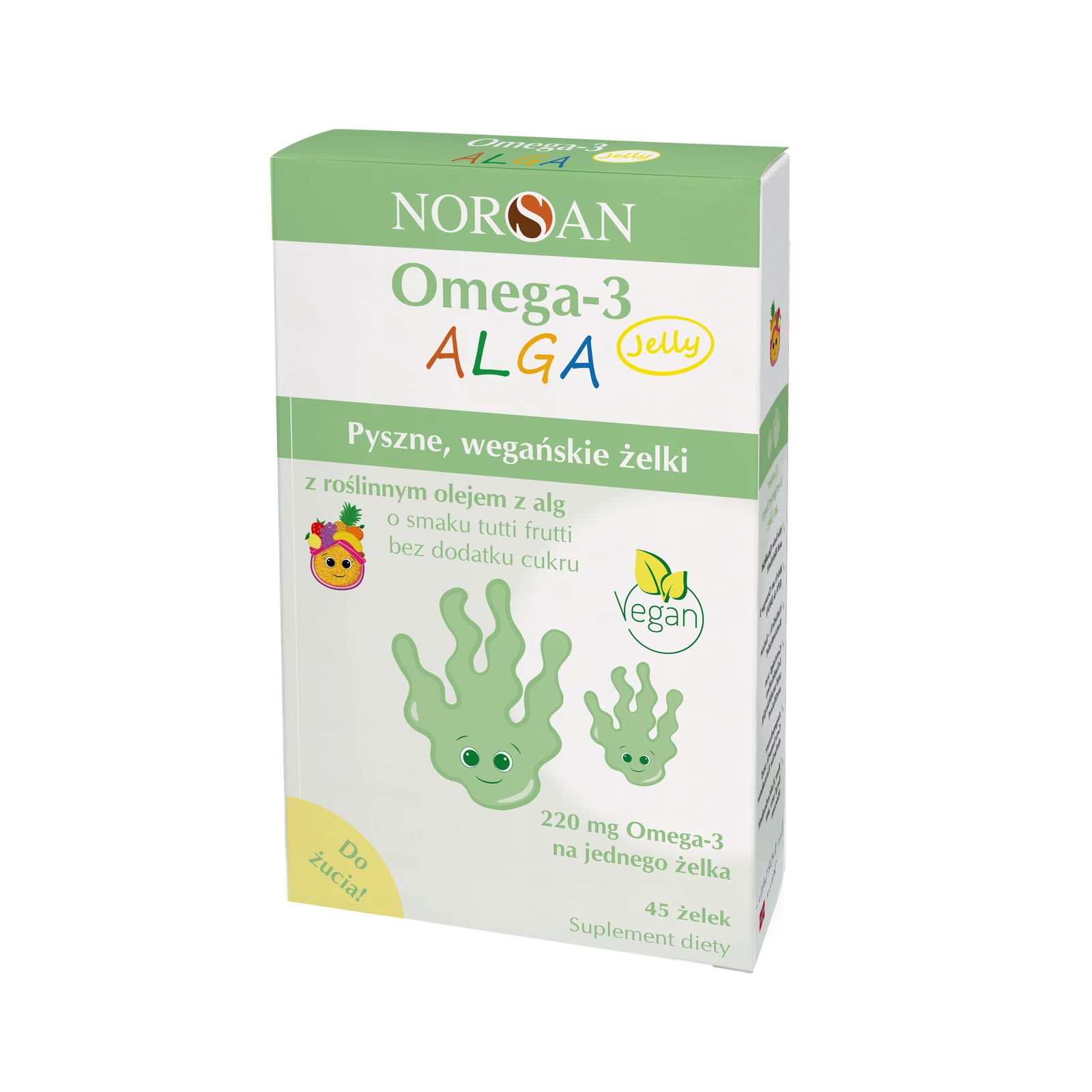 Produkt Norsan Omega-3 ALGA Jelly dla dzieci 45 żelek smak tutti frutti Norsan to suplement diety. Nie może być stosowany jako substytut zróżnicowanej diety. Pamiętaj o zrównoważonym sposobie żywienia i zdrowym trybie życia.- Przechowuj w chłodnym miejscu, z dala od bezpośredniego światła słonecznego.
