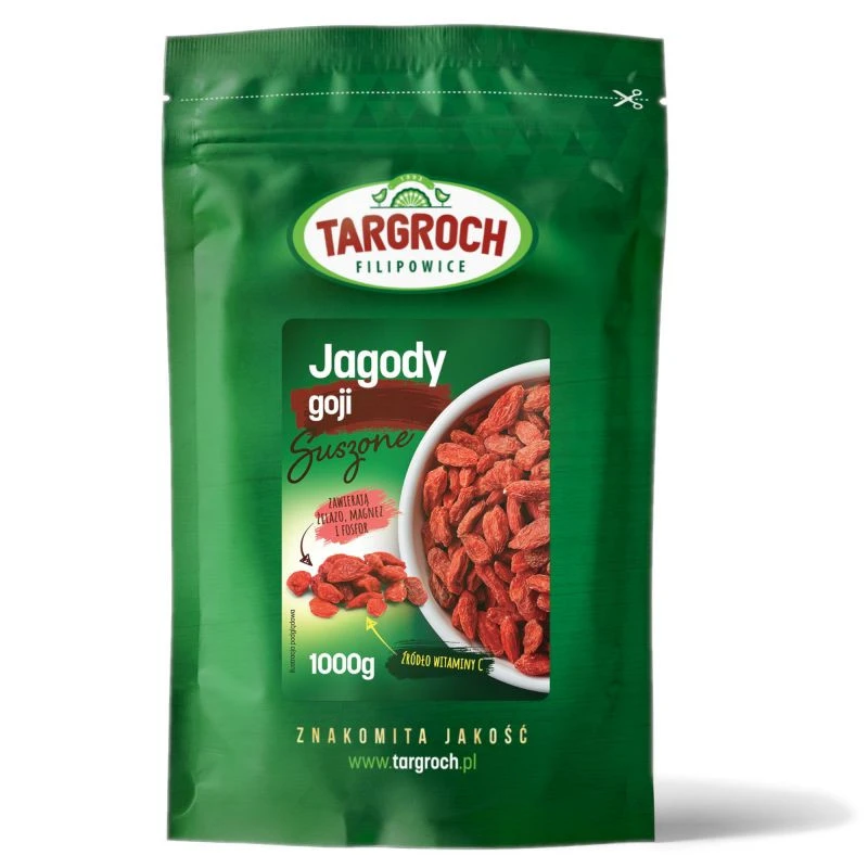 - Targroch Jagody Goji suszone to aromatyczna, lekko słodka przekąska zaliczana do kategorii superfoods.