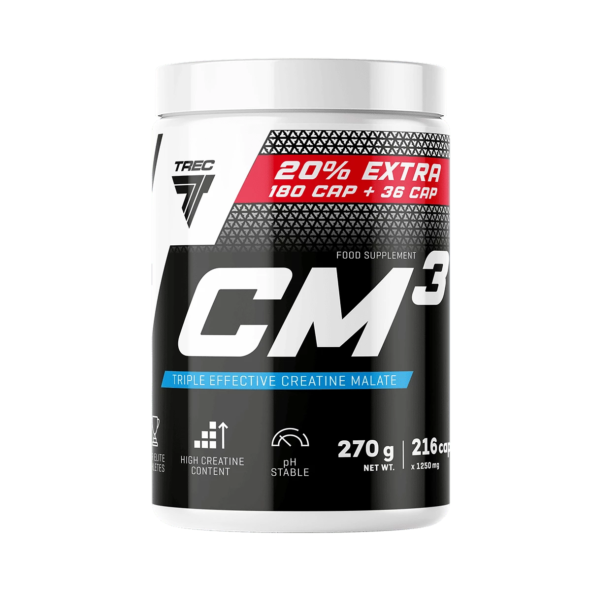 - CM3 to wysokiej jakości suplement diety, zawierający jabłczan trikreatyny. Kreatyna wspiera wydolność fizyczną podczas intensywnych i krótkotrwałych ćwiczeń fizycznych. Korzystny efekt uzyskasz przy spożywaniu 3 g kreatyny dziennie.