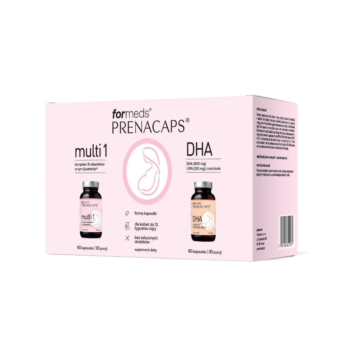 - ForMeds Prenacaps® Multi 1 + DHA (60 kapsułek + 60 kapsułek) to zestaw dwóch kompleksowych suplementów diety dedykowany kobietom do 12. tygodnia ciąży. Produkt ten zawiera witaminy, minerały oraz kwasy tłuszczowe omega-3.