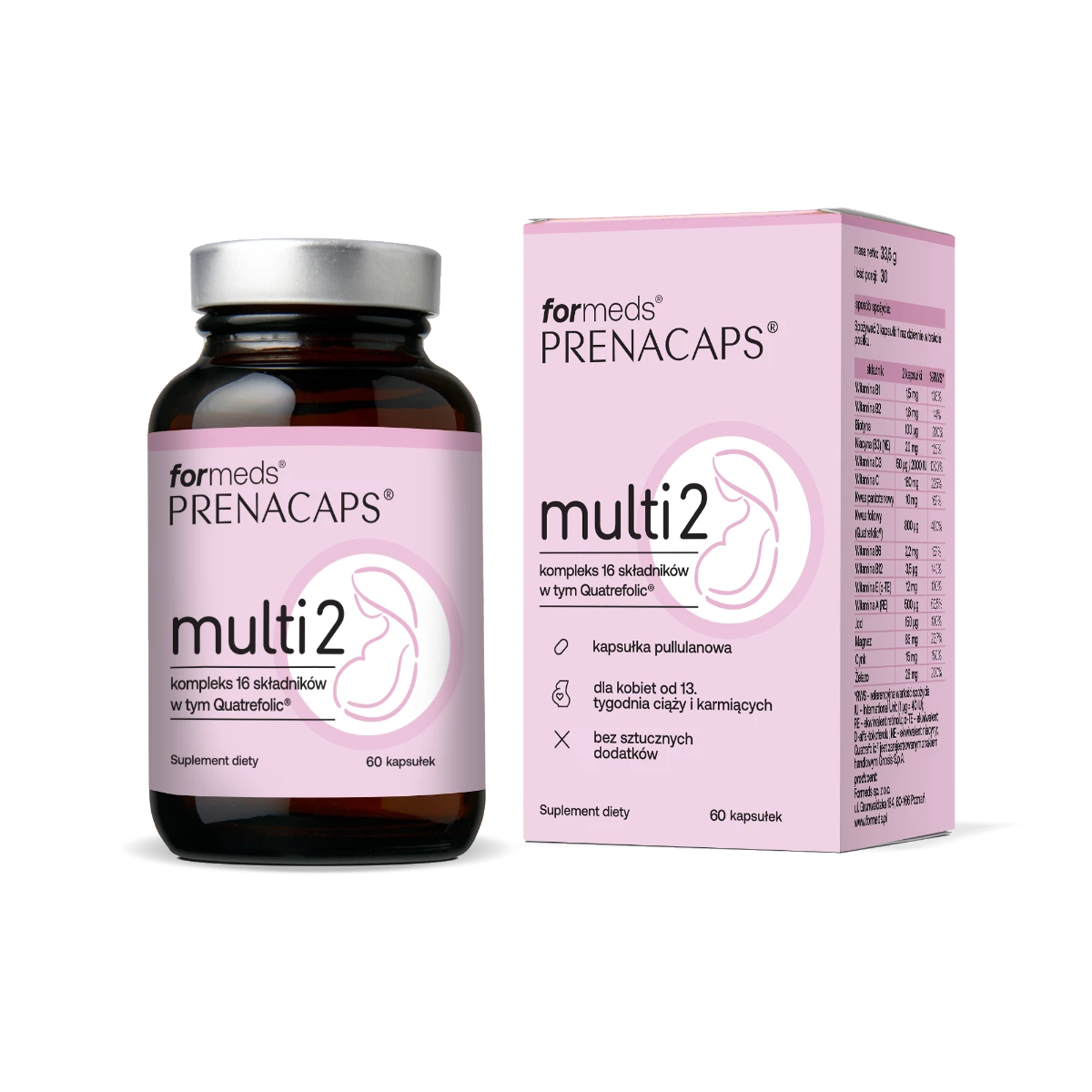 - ForMeds Prenacaps multi 2 to preparat zawierający niezbędne składniki, które są potrzebne do prawidłowego rozwoju płodu, dlatego jego suplementacja zalecana jest dla kobiet od 13 tygodnia ciąży i karmiących piersią.