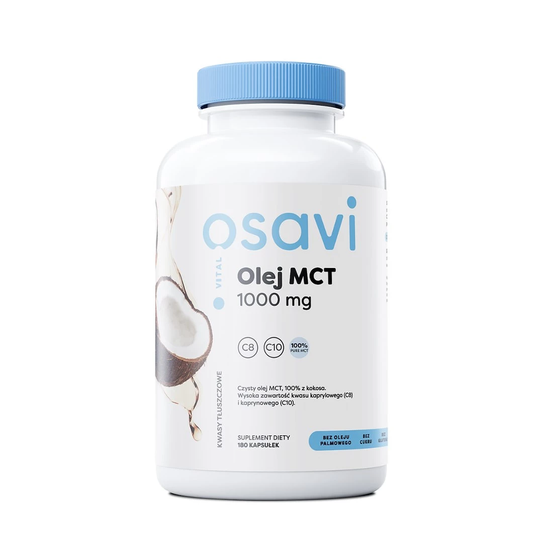 - OSAVI Olej MCT to naturalny, czysty produkt, który zawiera olej MCT, pochodzący w 100% z oleju owocu palmy kokosowej Cocos nucifera. Odznacza się on wysoką zawartością kwasu kaprylowego (C8) i kwasu kaprynowego (C10)