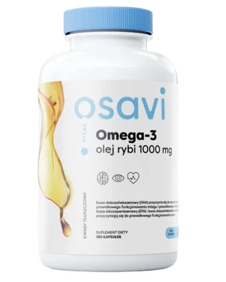 Produkt Osavi Omega 3 Olej Rybi 1000 mg 180 kapsułek o smaku cytrynowym Osavi to suplement diety. Nie może być stosowany jako substytut zróżnicowanej diety. Pamiętaj o zrównoważonym sposobie żywienia i zdrowym trybie życia.