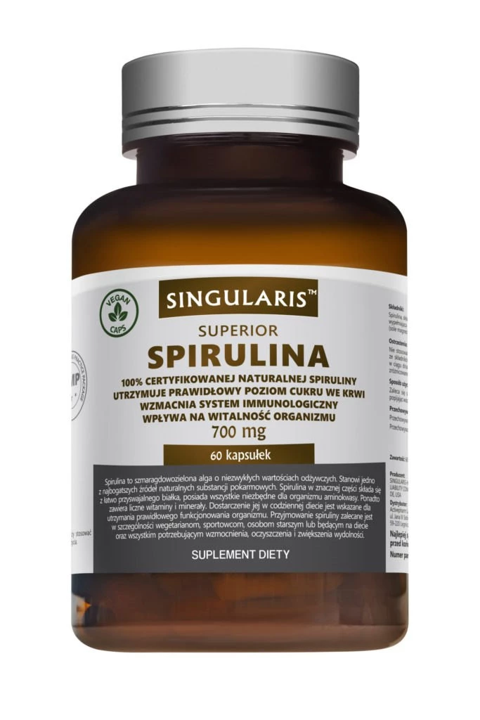 - Singularis Superior Spirulina 700 mg 60 kapsułek to produkt dostarczający wysokiej jakości spiruliny. Produkt marki Singularis jest naturalny i bezpieczny. Ma prosty skład, pozbawiony zbędnych dodatków i konserwantów.