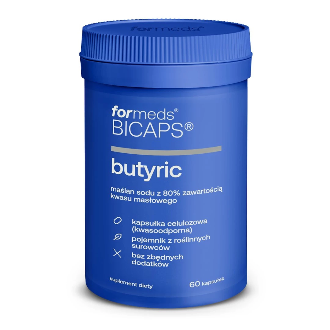 - ForMeds Bicaps Butyric maślan sodu 60 kapsułek to wysokiej jakości produkt, który stanowi bardzo dobre źródło należącego do krótkołańcuchowych kwasów tłuszczowych kwasu masłowego.