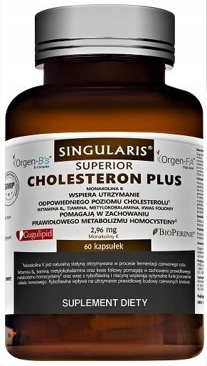 - Singularis Superior CHOLESTERON Plus to wysokiej jakości produkt, który zawiera mieszankę cennych substancji: ekstrakt z czerwonych drożdży z ryżu, który odznacza się zawartością 4% monakoliny K, witaminy z grupy B: tiamina, pirydoksyna, kobalamina.