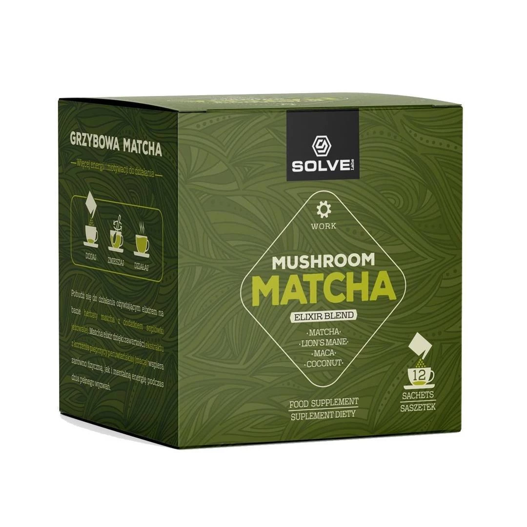 - SolveLabs Mushroom Matcha Elixir to w pełni wegański i naturalny produkt, który dostarcza połączenia herbaty Matcha, ekstraktów roślinnych, grzybów i przypraw. Zawiera między innymi grzyb Lion's Mane oraz korzeń Maca.