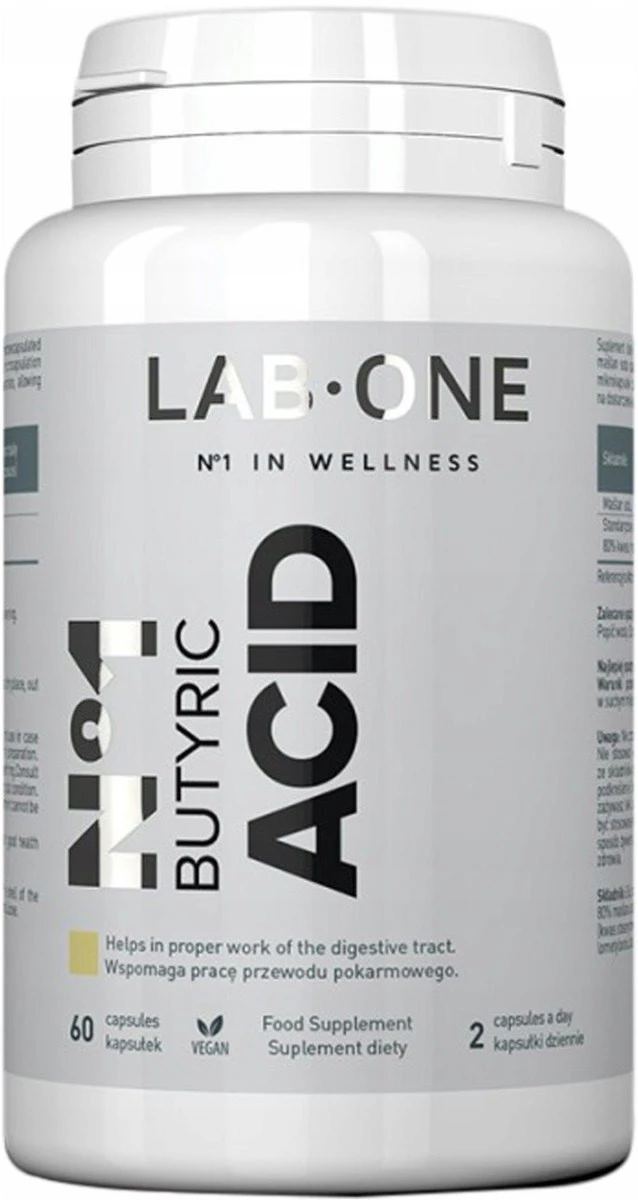 Suplement diety LAB ONE N°1 Butyric ACID 60 kapsułek to produkt w postaci kapsułek z maślanem sodu, czyli solą sodową, organicznym związkiem zawierającym w sobie resztę kwasu masłowego. Jego nazwa chemiczna to kwas butanowy.