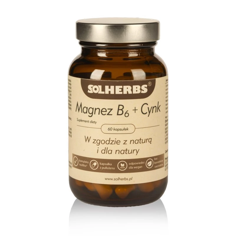 - SOLHERBS Magnez, B6 + Cynk 60 kapsułek to wysokiej jakości produkt, który stanowi naturalne źródło dobrze przyswajalnego magnezu, witaminy B6 i cynku. Preparat ten ma w 100% naturalny skład