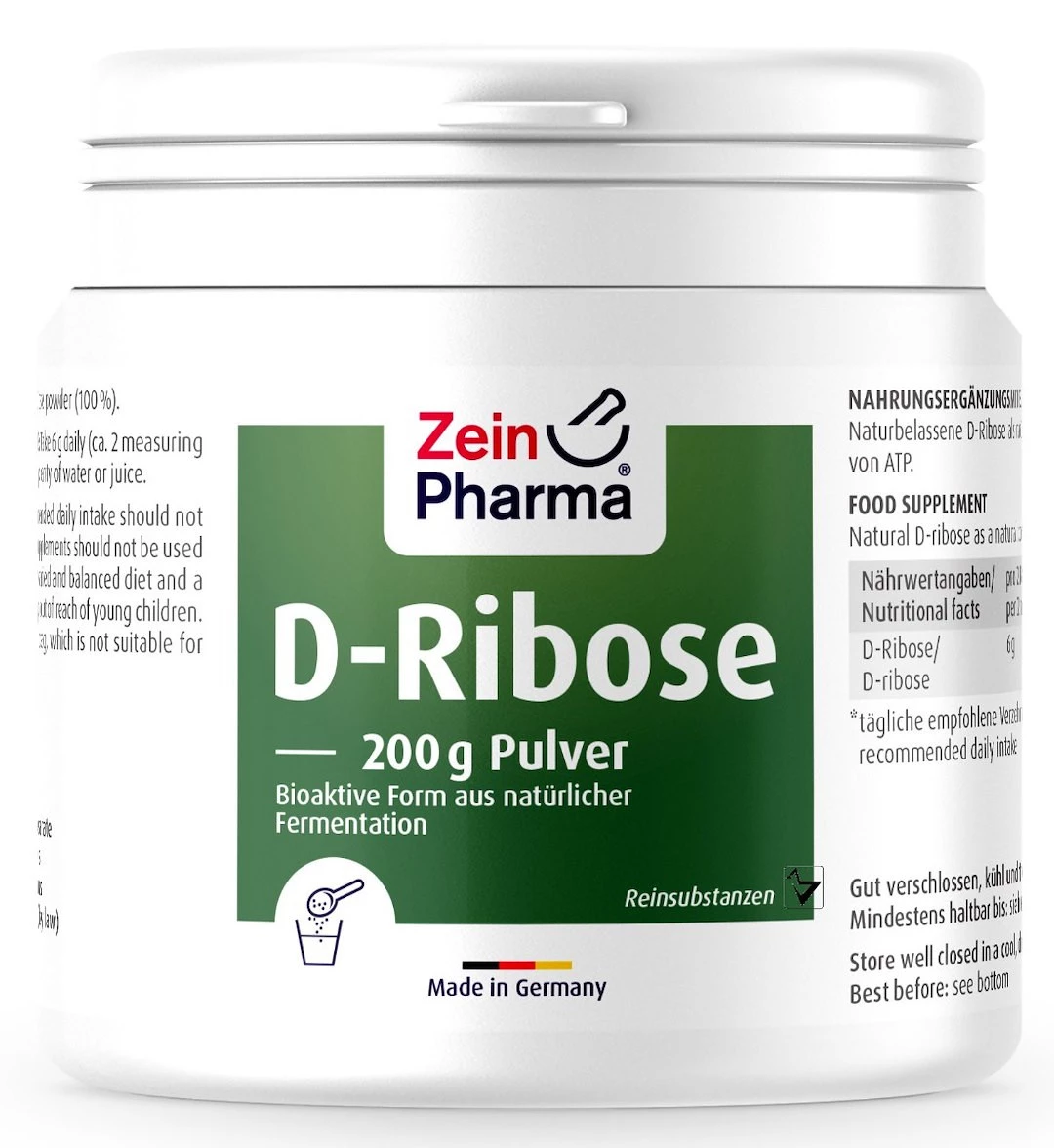 - Zein Pharma D-Ryboza 200 g to produkt o prostym składzie dostarczający D-rybozę w postaci proszku rozpuszczalnego w wodzie. Nie zawiera sztucznych dodatków ani alergenów takich jak gluten, laktoza czy soja.
