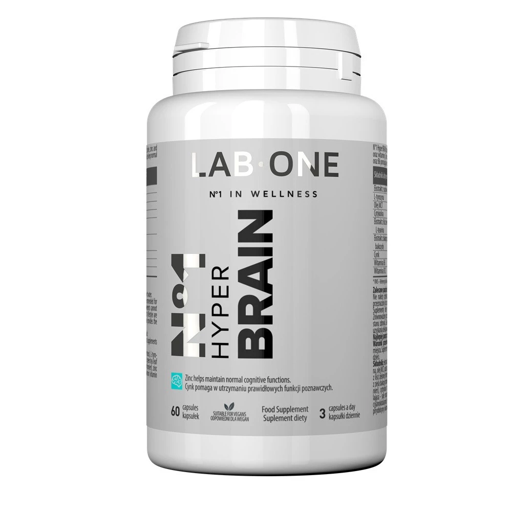- LAB ONE N°1 Hyber Brain 60 kapsułek to zaawansowany suplement diety, skoncentrowany na synergicznym działaniu składników, takich jak witamina B12, witamina B6 i cynk, które odgrywają kluczową rolę we wspieraniu funkcji układu nerwowego i odpornościowego.