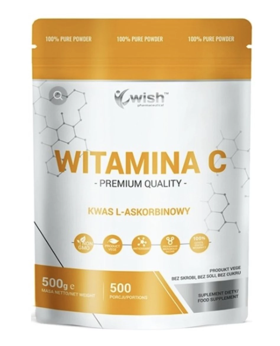 - Wish Witamina C 1000mg 500g to suplement diety, który zawiera witaminę C – substancję znaną z wielu wyjątkowych właściwości. Produkt ten dostępny jest w wygodnej do stosowania formie proszku i zawiera aż 500 porcji