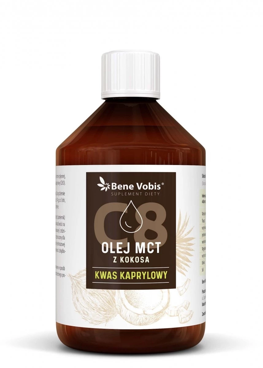 - Bene Vobis Olej MCT z kokosa Kwas kaprylowy 500ml to suplement diety w postaci oleju, zapakowany w praktyczną butelkę o pojemności 500 ml