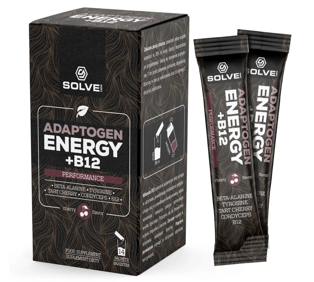 - SolveLabs Adaptogen Energy + B12 14 saszetek to suplement diety dedykowany osobom aktywnym fizycznie, które planują wprowadzić do swojej suplementacji dobrej jakości źródło adaptogenów, aminokwasów oraz witaminy B12