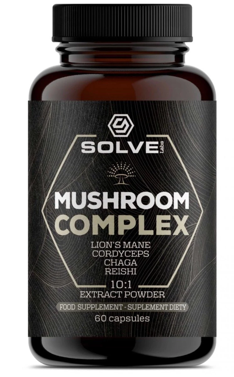 - SolveLabs Mushroom Complex 60 kapsułek to wysokiej jakości suplement diety, zawierający ekstrakty z 4 wyjątkowych grzybów: lion's mane, reishi, chagi i cordycepsu.
