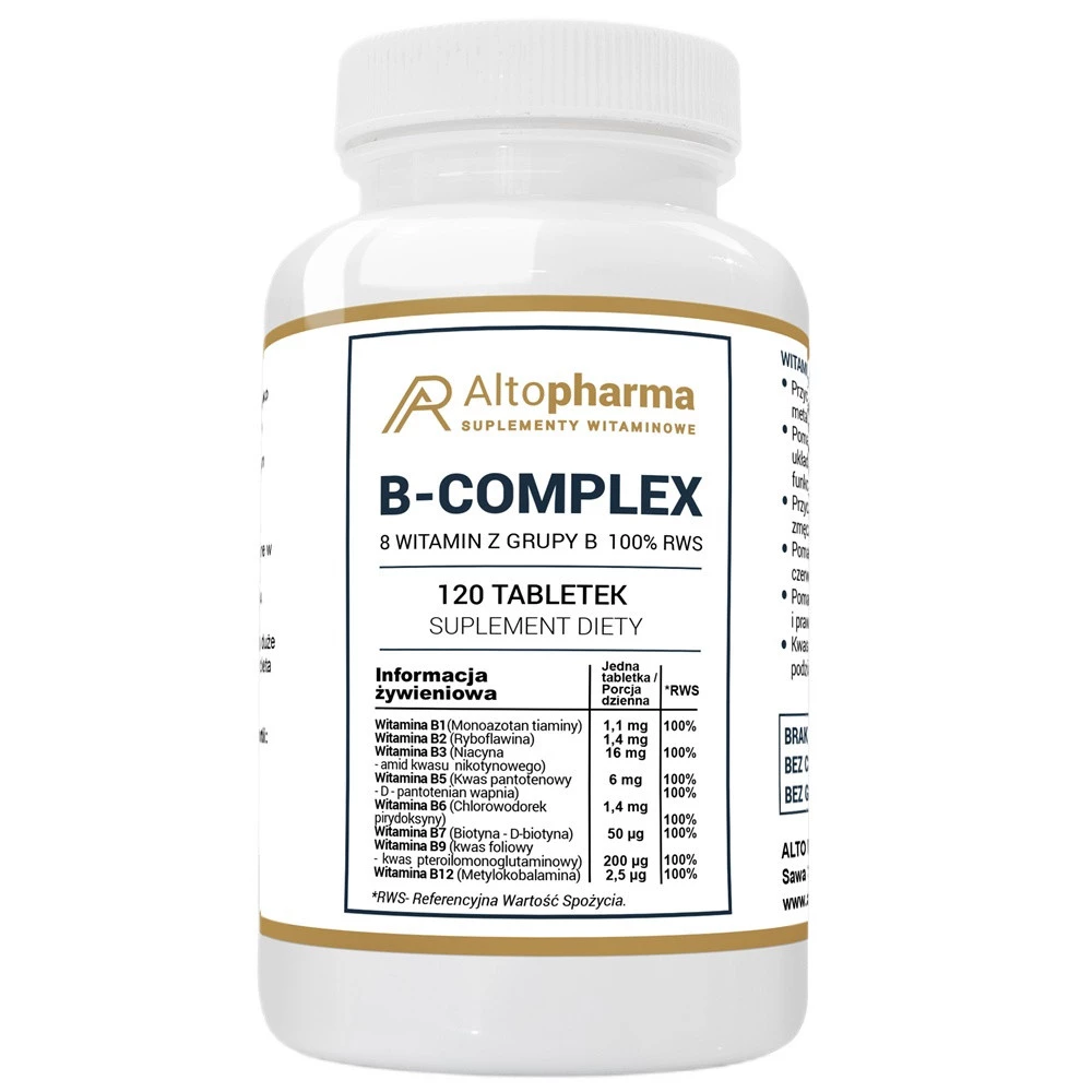 - Altopharma Witamina B Complex 100% 120 tabletek to suplement diety zaprojektowany z myślą o osobach dążących do wzbogacenia swojej suplementacji o dobrej jakości źródło witamin z grupy B.