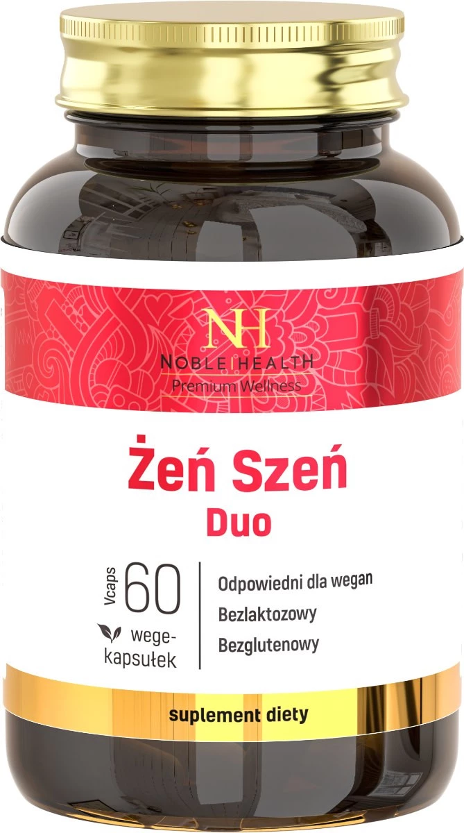- Suplement diety Noble Health Żeń Szeń Duo zawiera ekstrakty z dwóch rodzajów żeń-szenia: właściwego i amerykańskiego, które wspierają organizm w codziennym funkcjonowaniu.