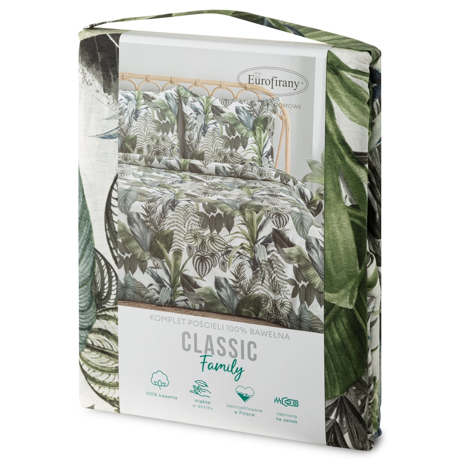 - Pościel DAVOS 2B z kolekcji Classic Family to połączenie naturalnej bawełny z eleganckim wzornictwem inspirowanym tropikalnym urokiem. Biała tkanina została ozdobiona motywem zielonych liści.