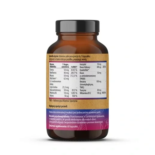 B Complex Amino to nowoczesny suplement diety, który łączy kompleks witamin B z opatentowanymi składnikami Quatrefolic® i VitaCholine®, wspierając układ nerwowy, metabolizm tłuszczów i funkcje poznawcze. To idealne rozwiązanie dla osób aktywnych umysłowo, fizycznie oraz dbających o zdrowie wątroby i prawidłowy poziom energii.