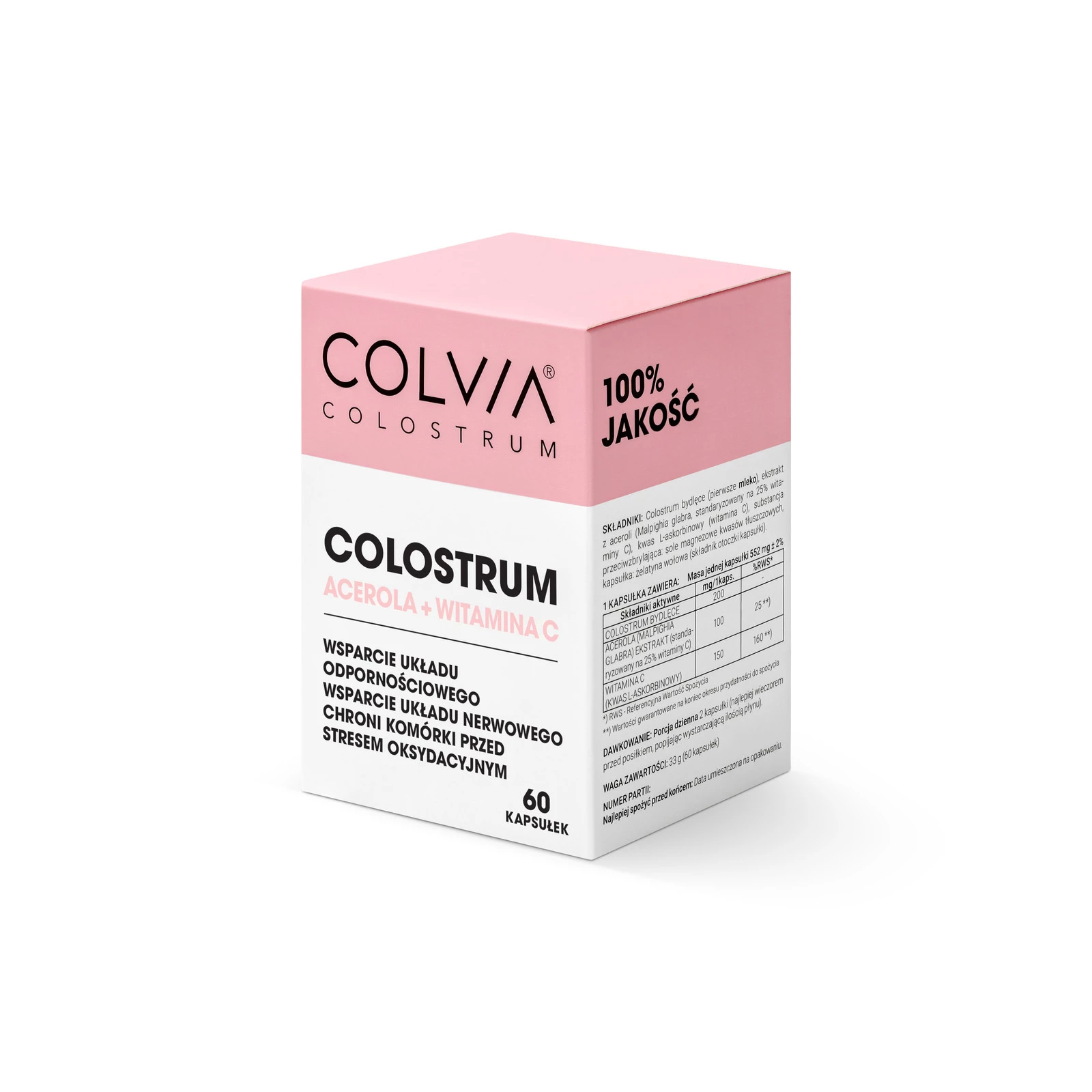 - Suplement diety COLVIA® Colostrum + Acerola + Witamina C to wyjątkowe połączenie siary bydlęcej, ekstraktu z aceroli i witaminy C. Zawarte składniki wspierają układ odpornościowy i nerwowy, chronią komórki przed stresem oksydacyjnym
