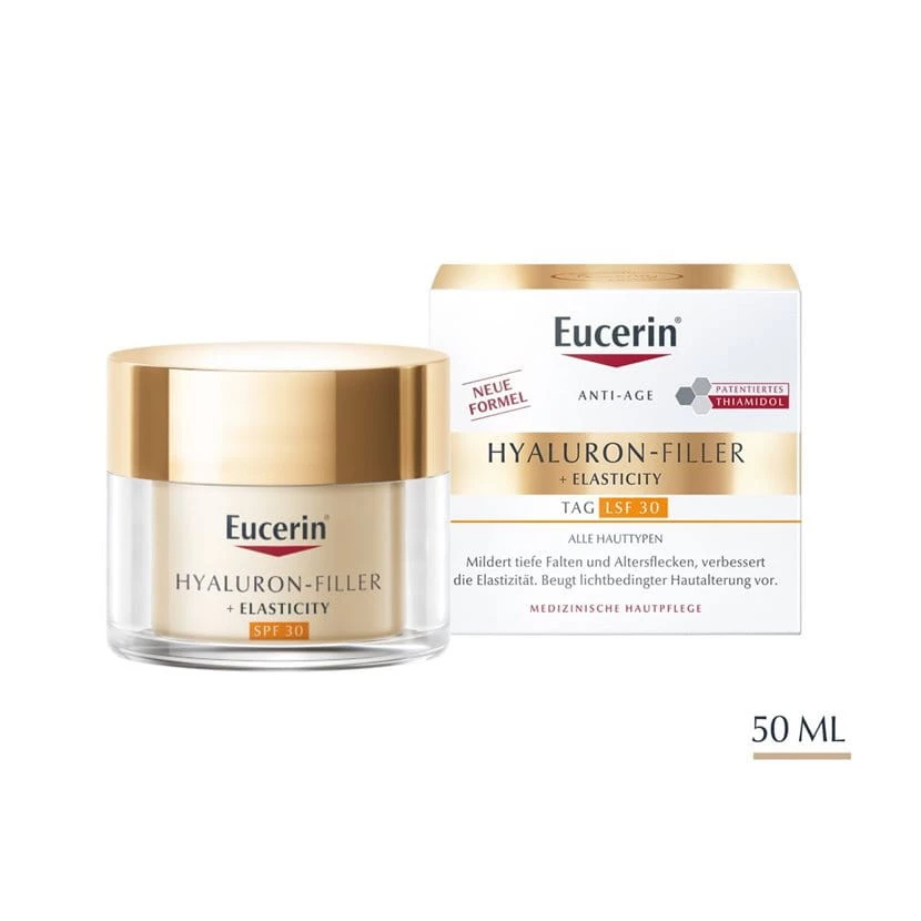 - Eucerin Hyaluron-Filler + Elasticity Krem na dzień SPF 30 to dermokosmetyk pielęgnujący skórę dojrzałą, zapewniając jej jędrność, odżywienie, redukcję przebarwień dzięki zawartości Thiamidolu i ochronę przed promieniami UV.
