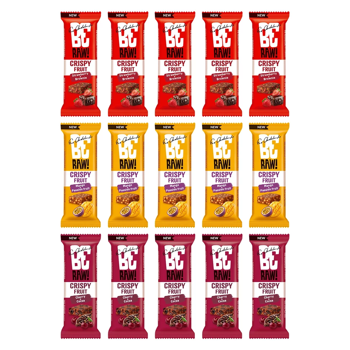 Zestaw mix smaków Be Raw! Baton: 5szt. owocowy wiśnia i kakao bez 40 g bez cukru, 5szt. owocowy Truskawka z Brownie 40g bez cukru, 5szt. owocowy mango i marakuja bez 40 g bez cukru