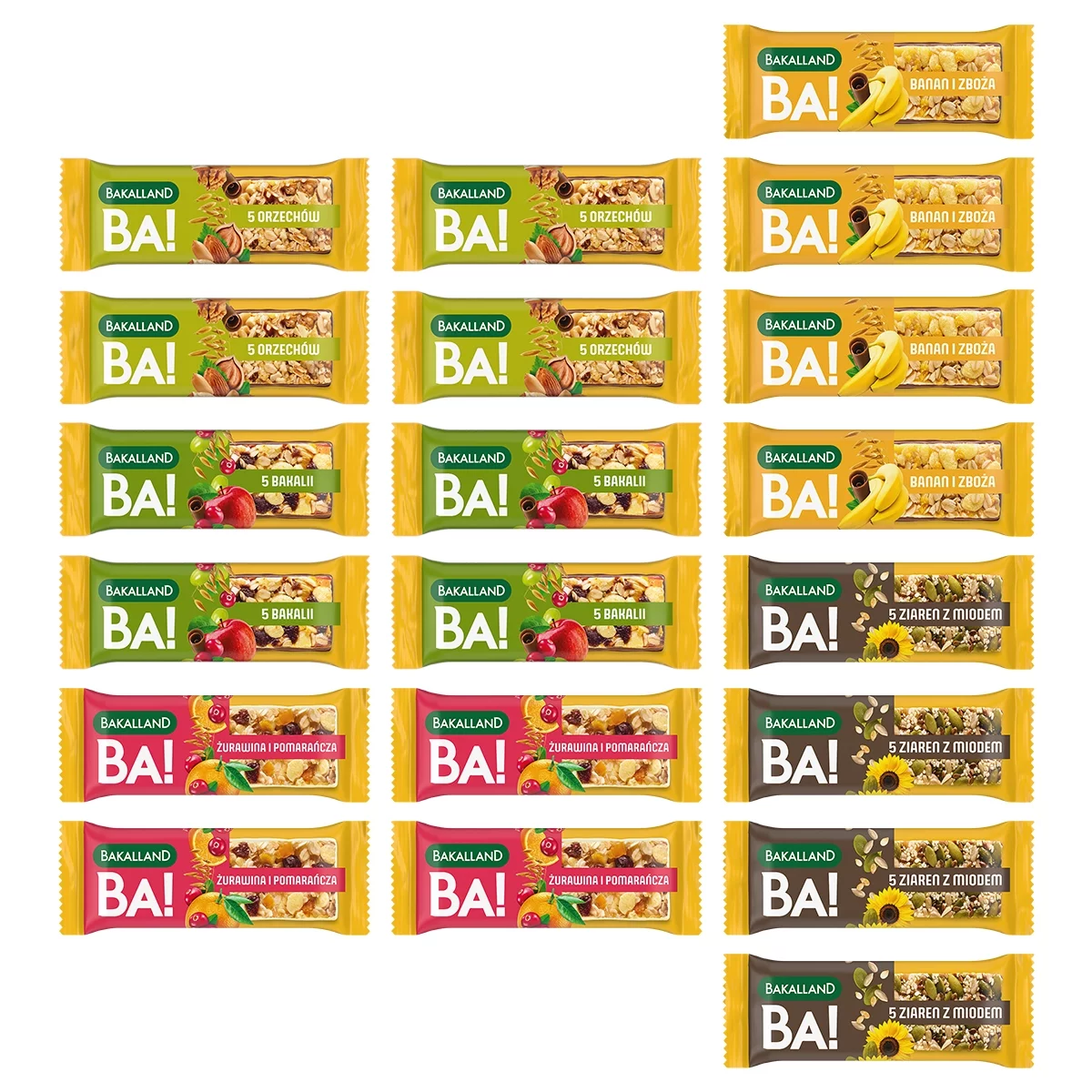 Zestaw mix smaków Bakalland BA! Baton zbożowy: 4szt. 5 bakalii 40g, 4szt. 5 orzechów 40g, 4szt. 5 ziaren z miodem 40g, 4szt. banan 40g, 4szt. żurawina i pomarańcza 40g