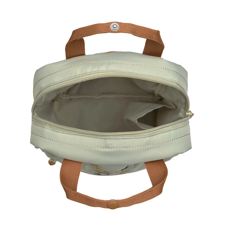 Funkcjonalny kwadratowy mini plecak niemieckiej marki LASSIG. Sprawdzi się zarówno do przedszkola, jak i podczas wycieczek. Jest lekki, wygodny, o optymalnej pojemności 7l. Plecak wyróżnia się nietuzinkową kolorystyką: jasny khaki materiał kontrastuje z karmelowymi detalami, takimi jak rączki, regulowane pasy czy ozdobne sznureczki przy suwakach. Z przodu znajduje się uroczy kolorowy napis „Happy Little Soul”. Materiał plecaka jest łatwy w czyszczeniu i odporny na wilgoć.