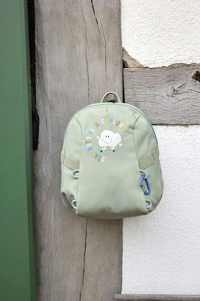 Plecak ma jasny kolor khaki z kontrastowymi detalami, napis STAY OUTSIDE & EXPLORE i zabawną grafikę z radosną chmurką na deskorolce.