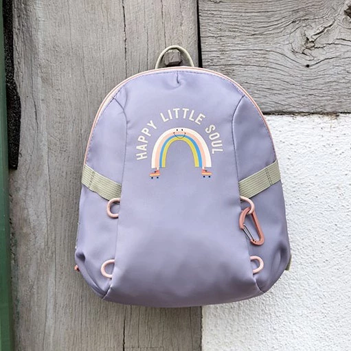 Plecak ma kolor liliowy z kontrastowymi detalami (khaki i jasny róż), napis HAPPY LITTLE SOUL i zabawną grafikę z radosną tęczą na wrotkach.