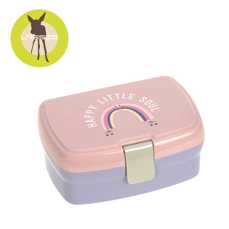 Pojemnik jest liliowo-różowy. Na wieczku znajduje się napis HAPPY LITTLE SOUL i zabawna grafika z tęczą na wrotkach.