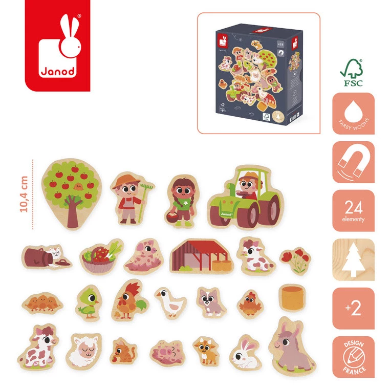 Zestaw drewnianych magnesów Na farmie francuskiej marki Janod to wspaniały prezent dla kilkulatka. Zestaw zawiera 24 magnesy różnej wielkości, nawiązujące do tematyki farmy, w tym: zwierzęta, rolników czy traktor.