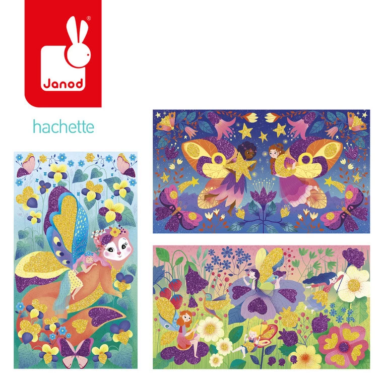 Zestaw kreatywny Magiczny brokat Wróżki francuskiej marki JANOD zawiera 3 plansze-obrazki z powłoką samoprzylepną, przedstawiające baśniowy świat wróżek. Ilustracje te można – w wyznaczonych miejscach – posypać dołączonym do zestawu brokatem w tubkach, w 2 kolorach: złotym i ciemnoróżowym. W komplecie znajduje się też drewniana szpatułka do odkrywania powierzchni, przeznaczonych do ozdabiania i równomiernego rozprowadzania brokatu.