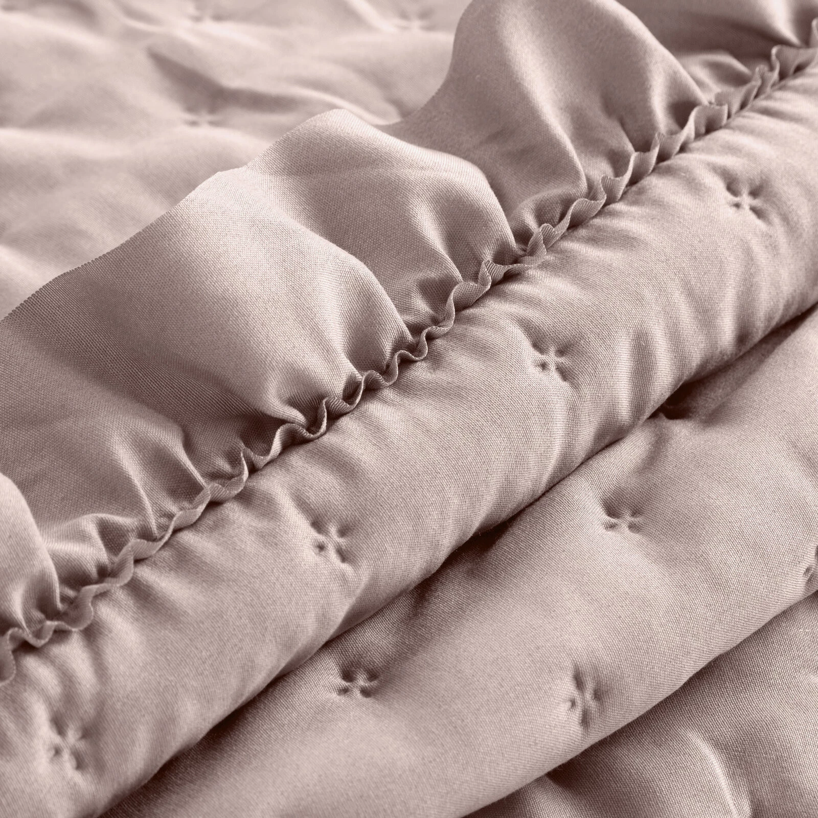 - Narzuta jednokolorowa wykonana techniką hot press, obszyta falbaną szerokość: 170 cm, długość: 210 cm, kolor: pudrowy, Gramatura: 80 GSM, Skład: 100% poliester