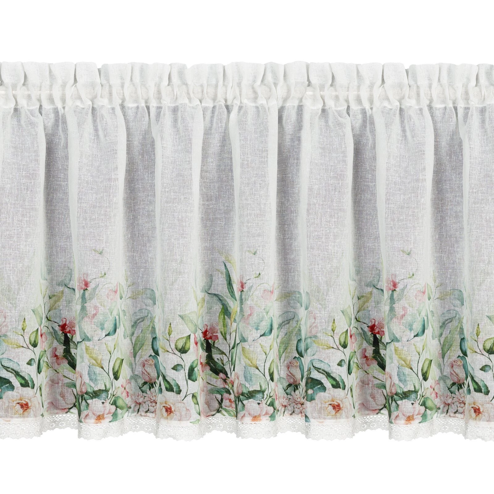 - Zazdrostka z nadrukiem zdobiona koronką szerokość: 150 cm, długość: 60 cm, kolor: biały, Gramatura: 110 GSM, Skład: 100% poliester