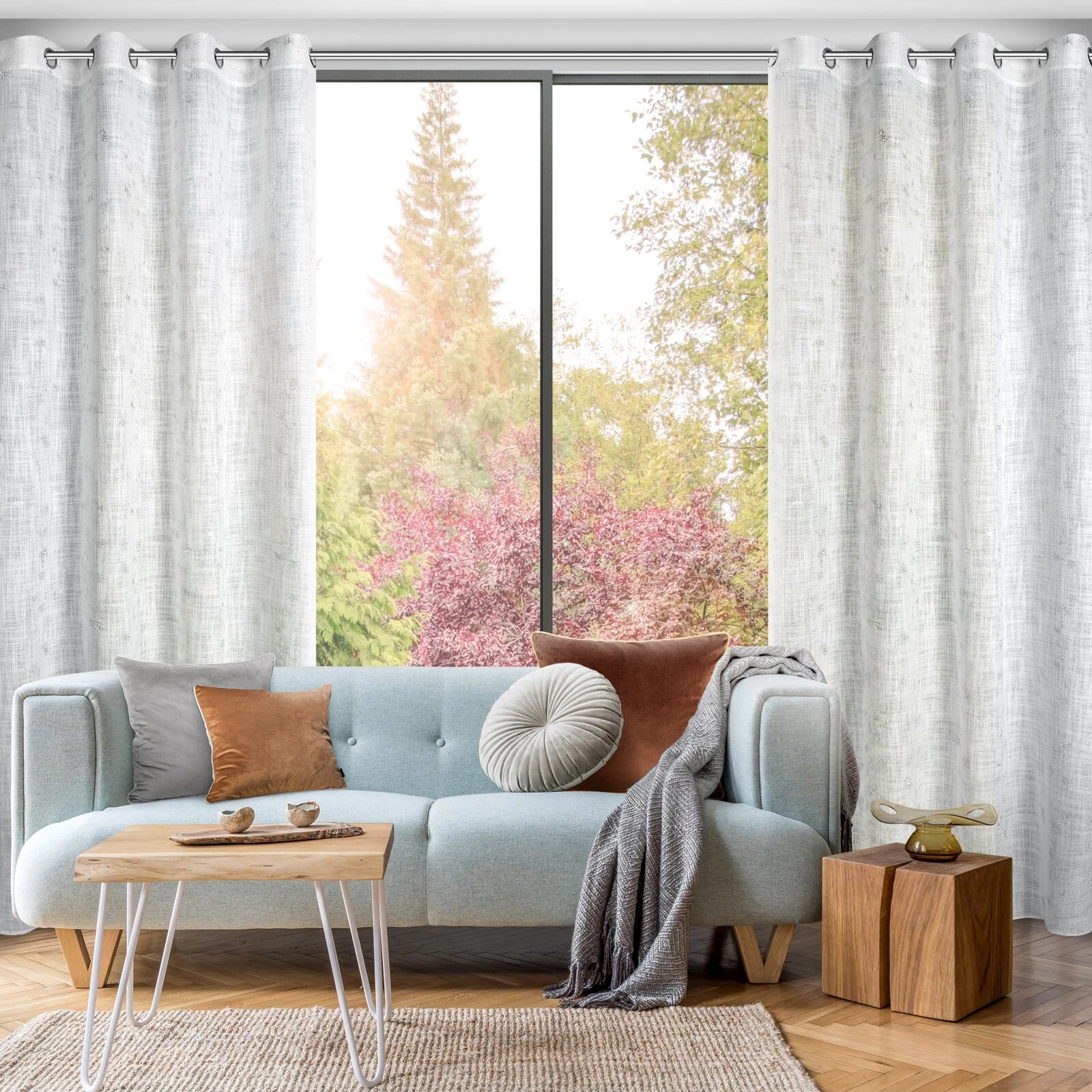 - Zasłona gotowa w stylu eko z błyszczącym nadrukiem szerokość: 140 cm, długość: 250 cm, kolor: kremowy, Gramatura: 270 GSM, Skład: 100% poliester
