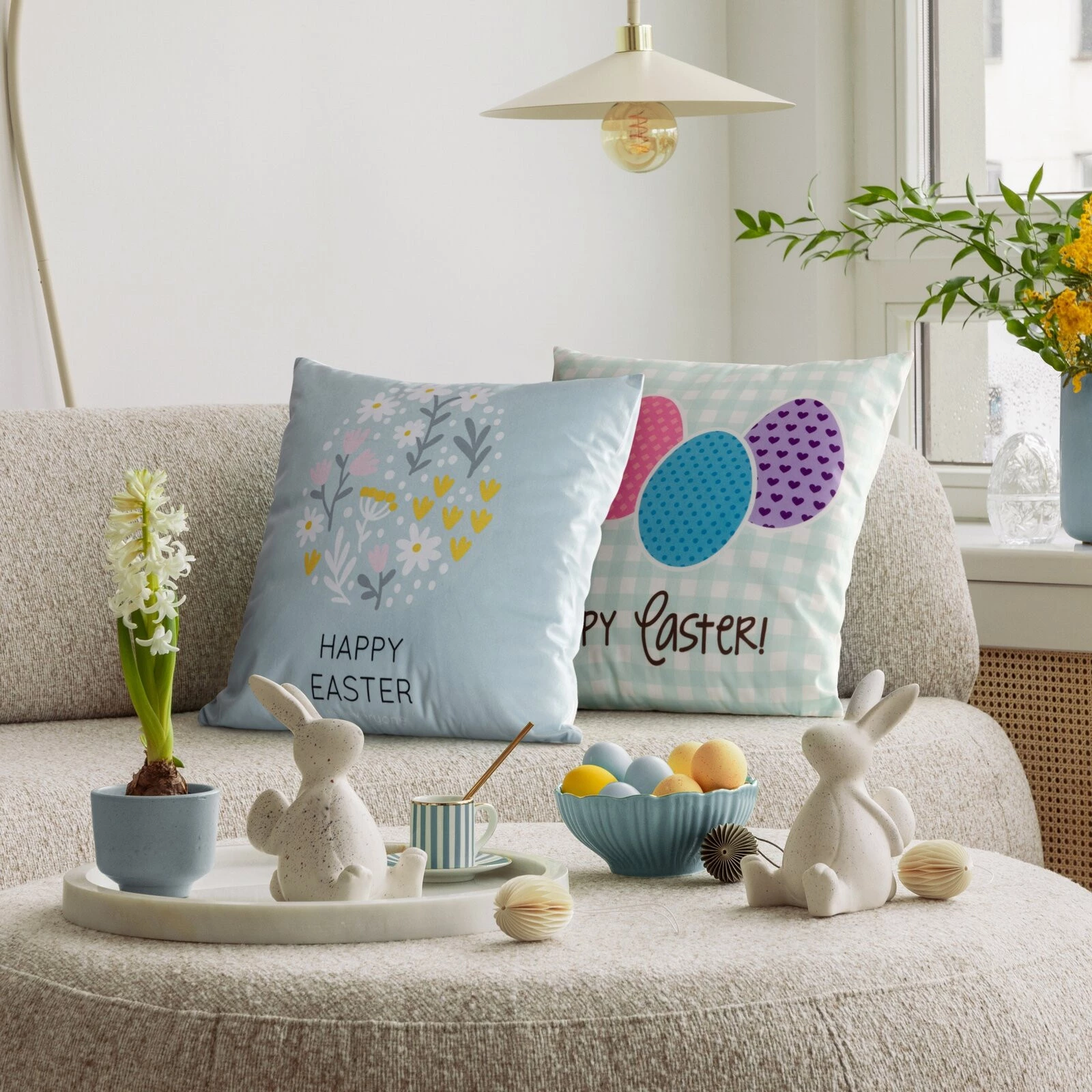 - Poszewka wykonana z weluru z ozdobnym nadrukiem wielkanocnym szerokość: 45 cm, długość: 45 cm, kolor: niebieski, Gramatura: 140 GSM, Skład: 100% poliester
