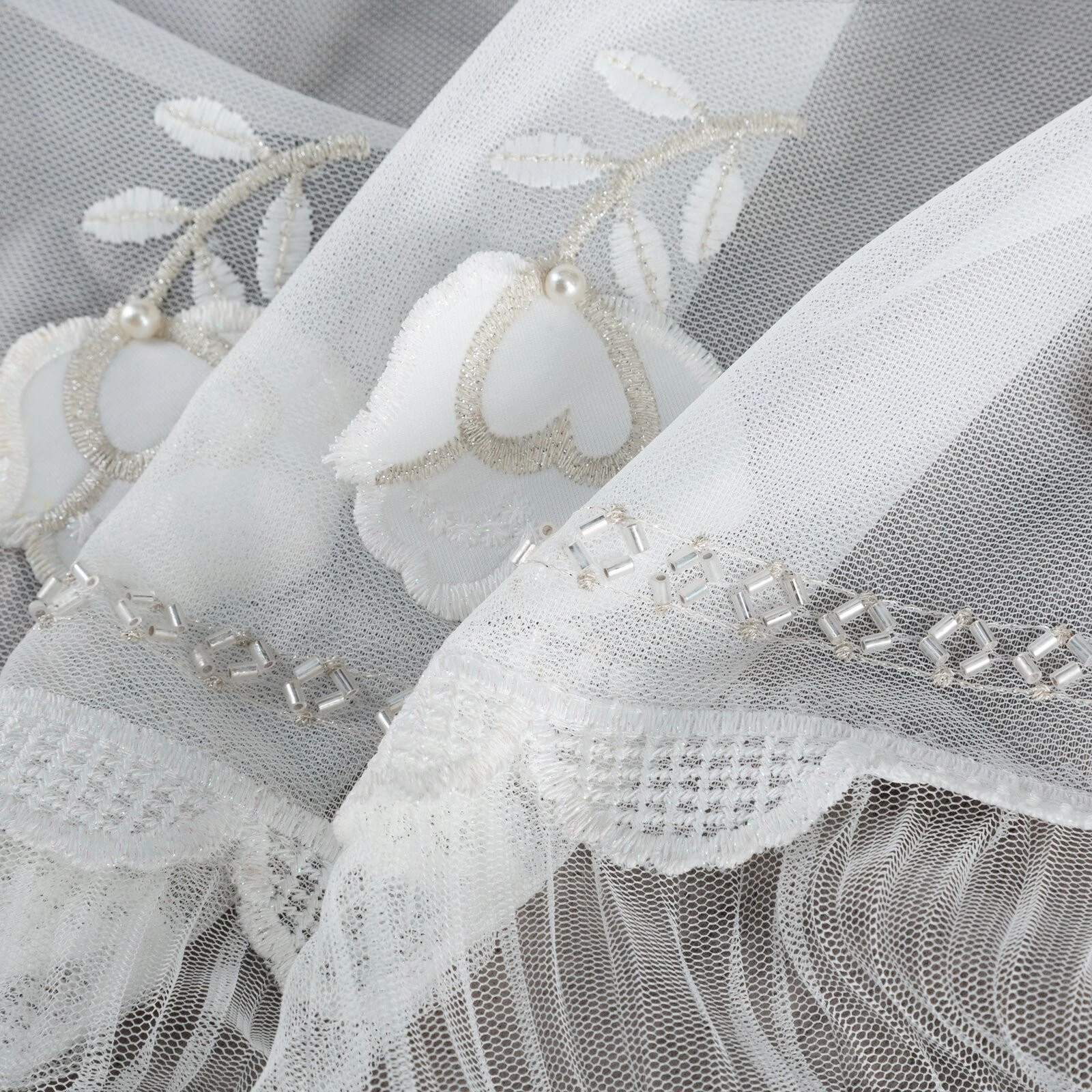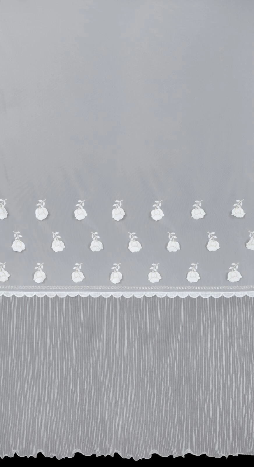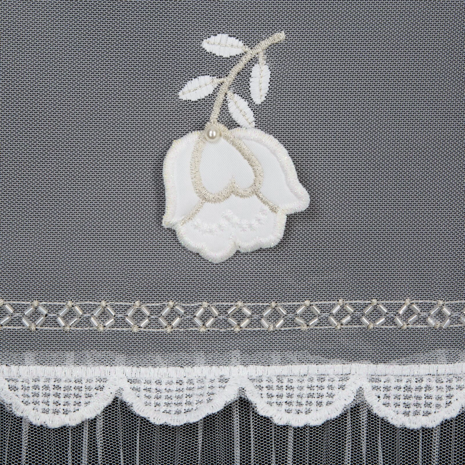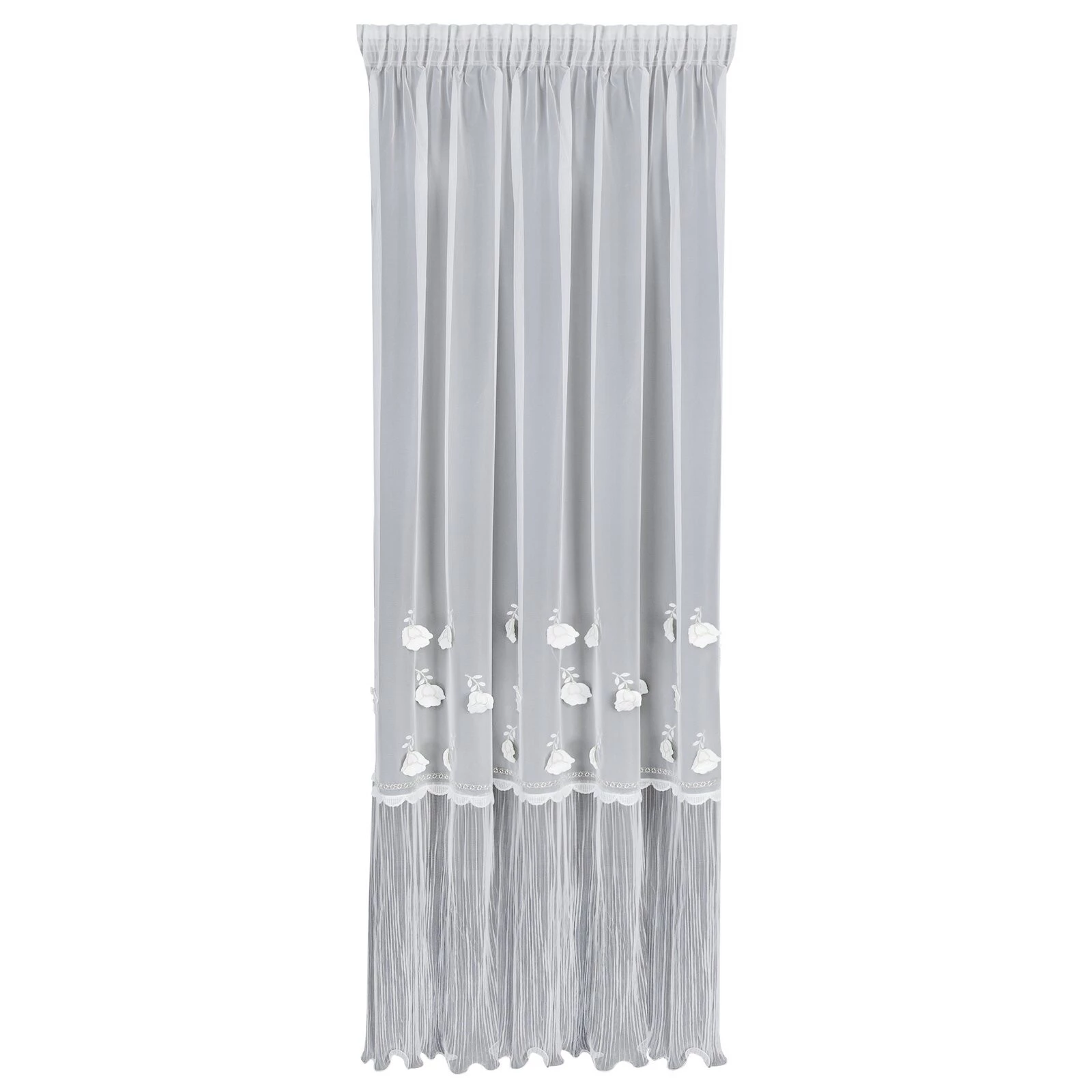 - Firana gotowa zdobiona kwiatowymi aplikacjami oraz falbaną u dołu szerokość: 140 cm, długość: 270 cm, kolor: biały, Gramatura: 50 GSM, Skład: 100% poliester