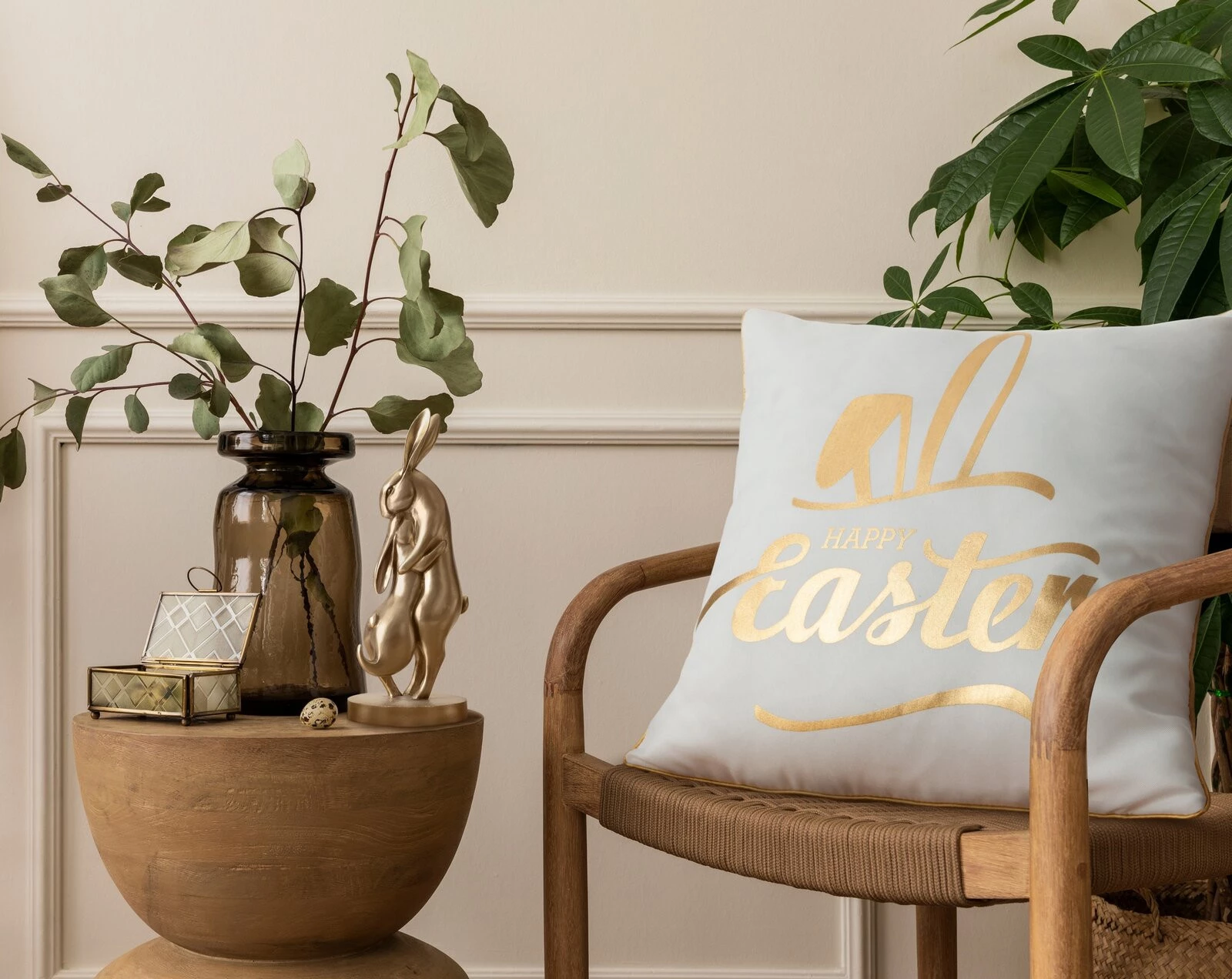 - Poszewka dekoracyjna ze złotym nadrukiem i ozdobną lamówką szerokość: 45 cm, długość: 45 cm, kolor: biały, Gramatura: 140 GSM, Skład: 100% poliester