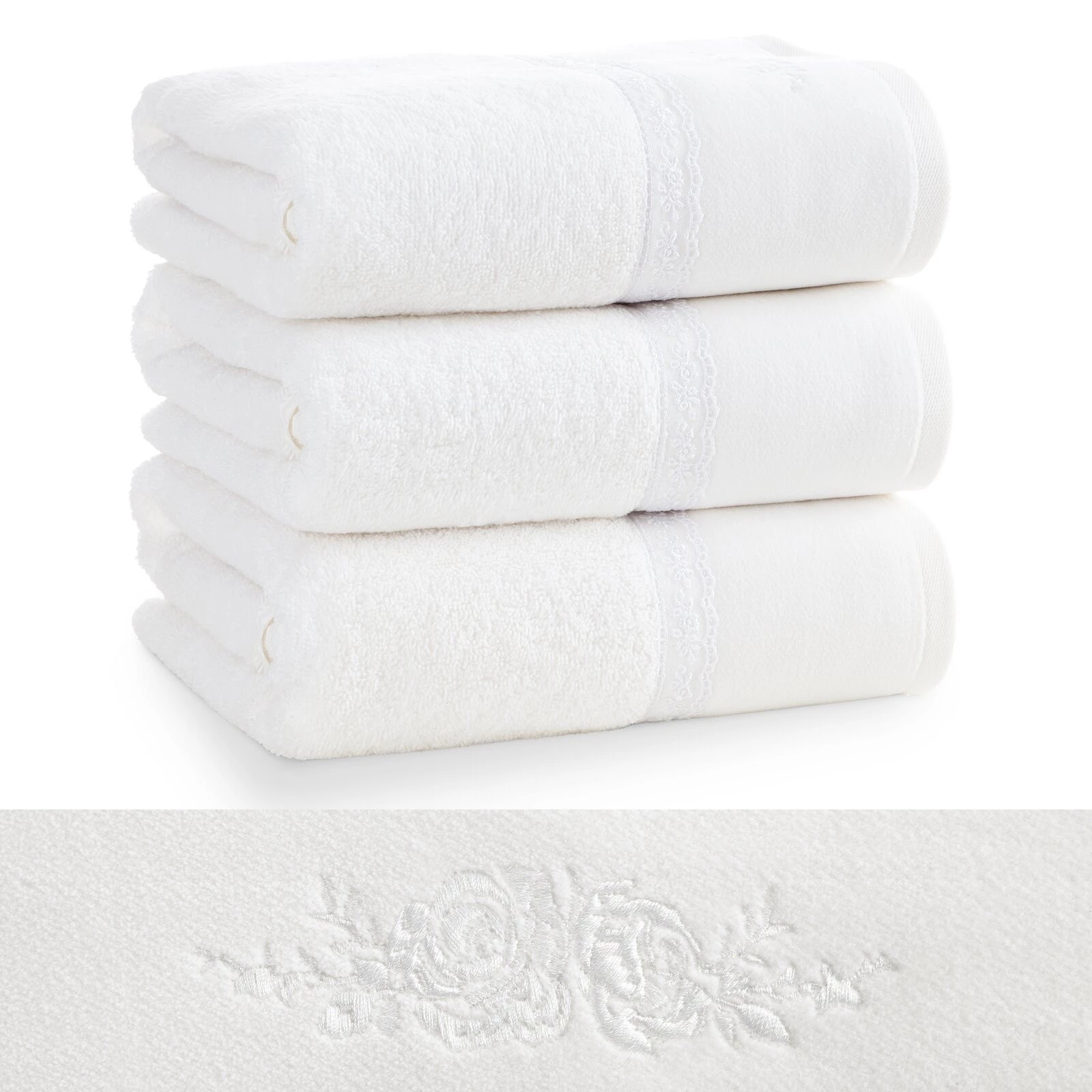 - Piękny ręcznik kąpielowy z miękkiej i chłonnej bawełny frotte zdobiony na bordiurze aplikacją w formie serduszek wypełnionych różyczkami. Doskonały na prezent. szerokość: 70 cm, długość: 140 cm, kolor: biały, Gramatura: 500 GSM, Skład: 100% bawełna; część