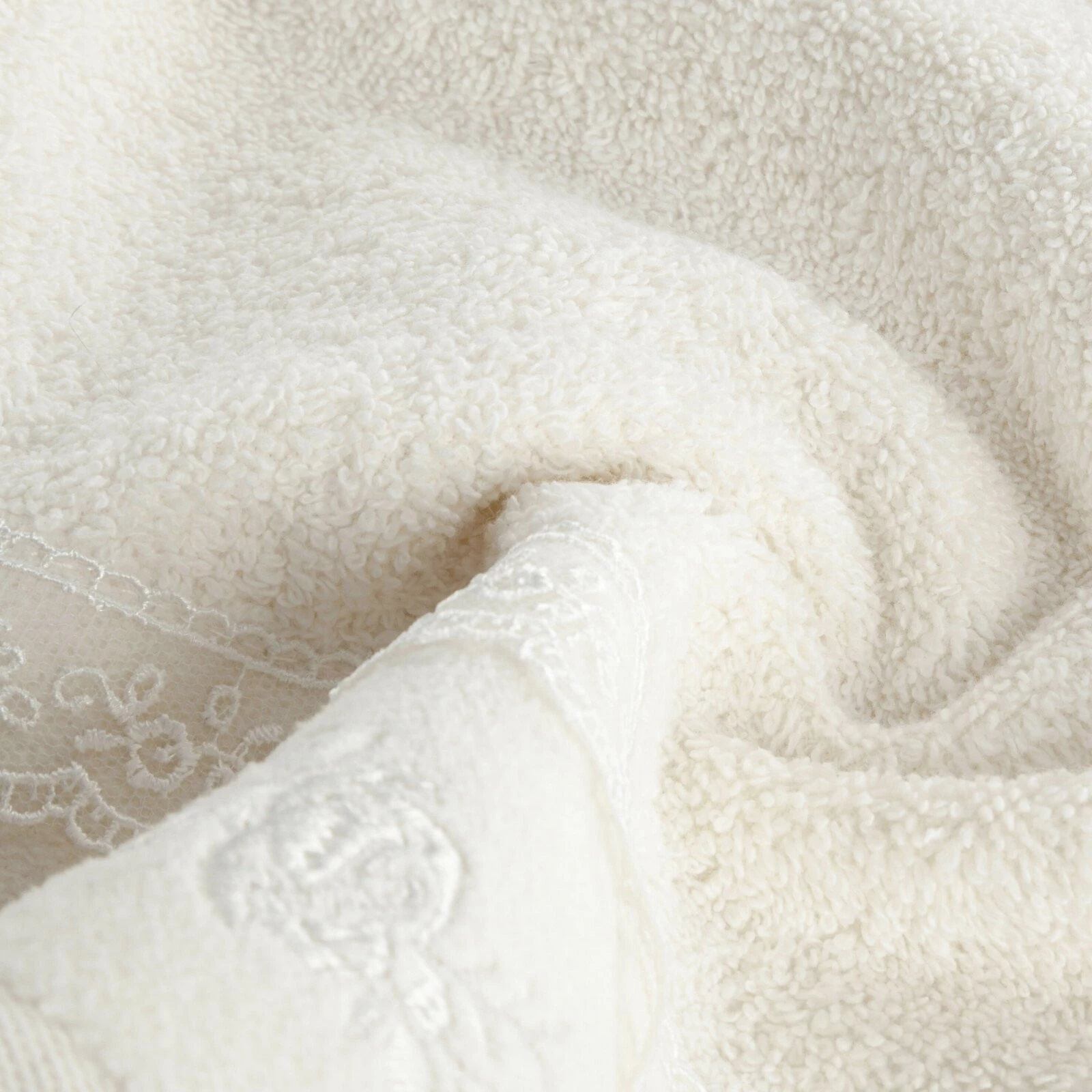 - Piękny ręcznik kąpielowy z miękkiej i chłonnej bawełny frotte zdobiony na bordiurze aplikacją w formie serduszek wypełnionych różyczkami. Doskonały na prezent. szerokość: 70 cm, długość: 140 cm, kolor: kremowy, Gramatura: 500 GSM, Skład: 100% bawełna; czę