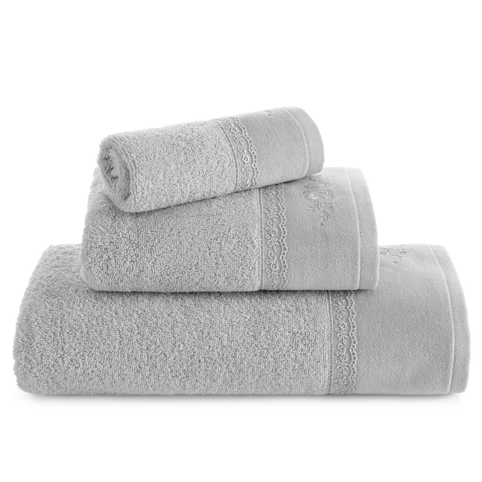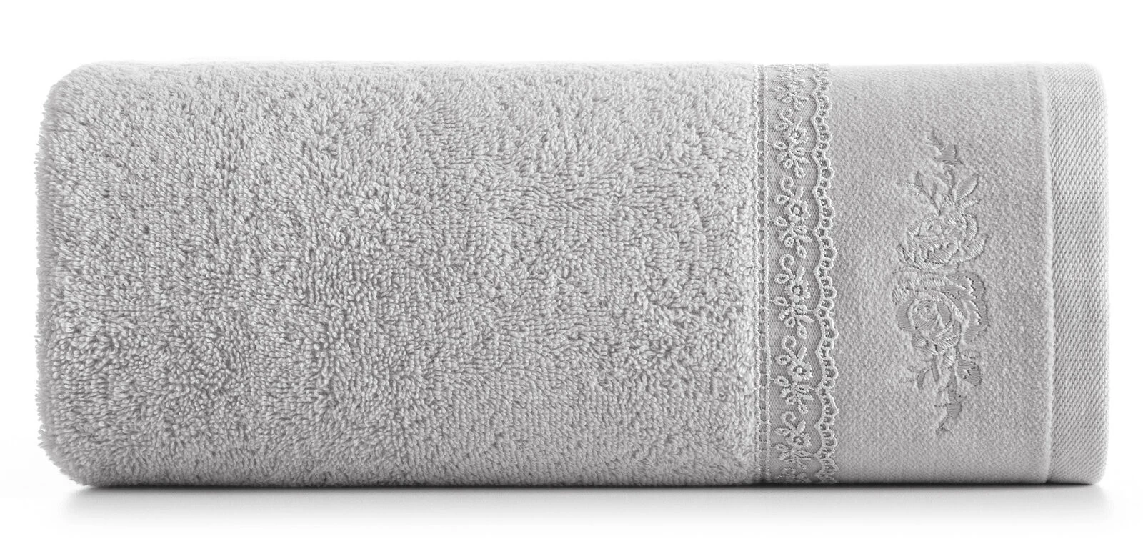 - Piękny ręcznik kąpielowy z miękkiej i chłonnej bawełny frotte zdobiony na bordiurze aplikacją w formie serduszek wypełnionych różyczkami. Doskonały na prezent. szerokość: 30 cm, długość: 50 cm, kolor: srebrny, Gramatura: 500 GSM, Skład: 100% bawełna; częś