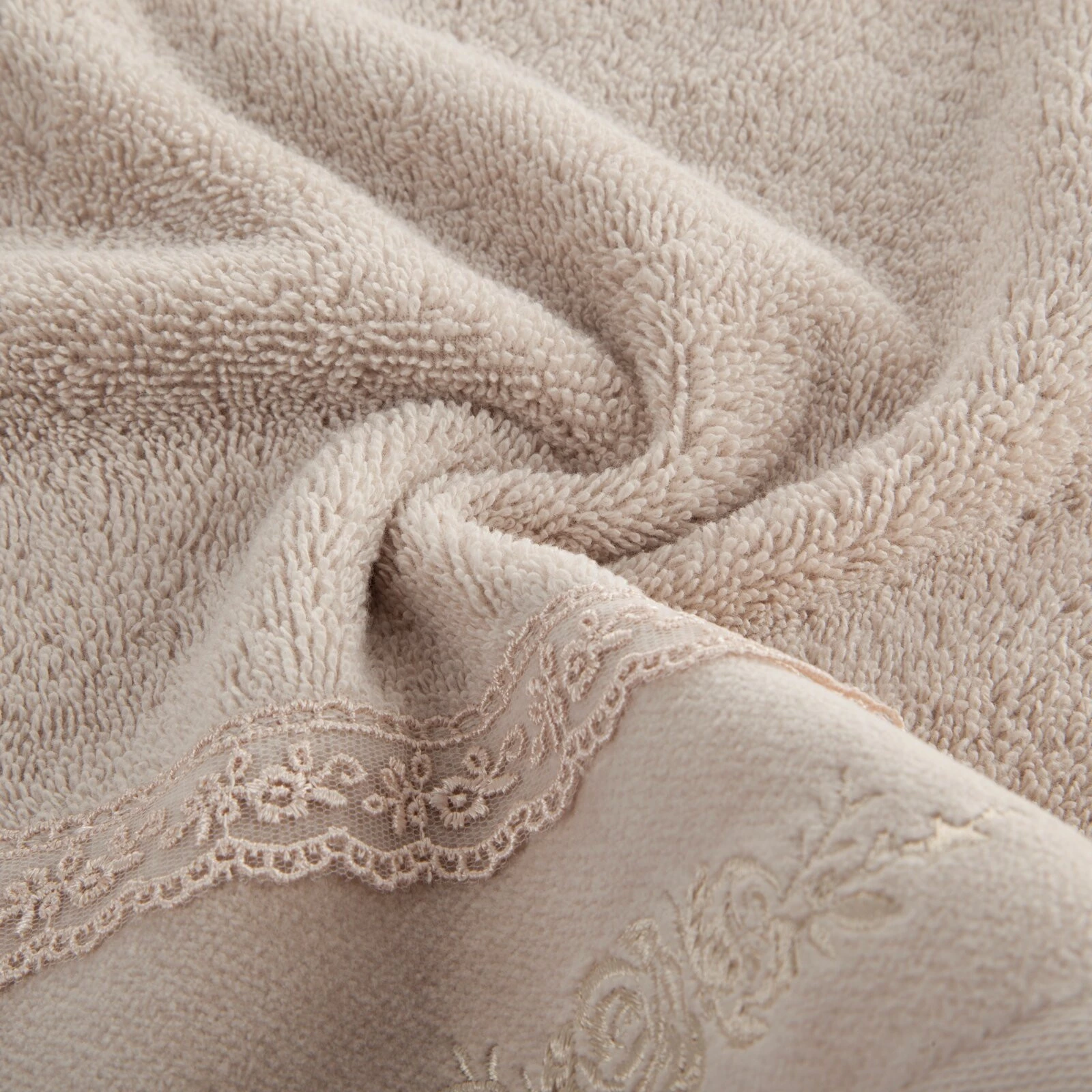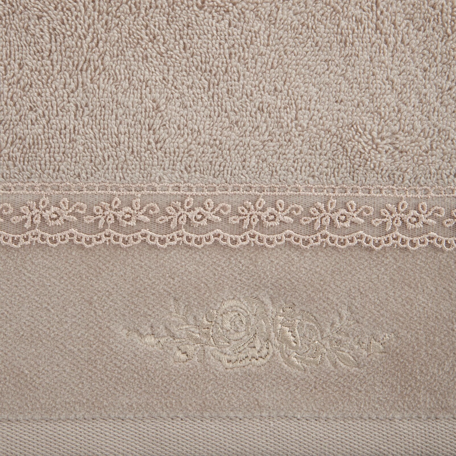 - Piękny ręcznik kąpielowy z miękkiej i chłonnej bawełny frotte zdobiony na bordiurze aplikacją w formie serduszek wypełnionych różyczkami. Doskonały na prezent. szerokość: 50 cm, długość: 90 cm, kolor: beżowy, Gramatura: 500 GSM, Skład: 100% bawełna; część